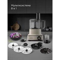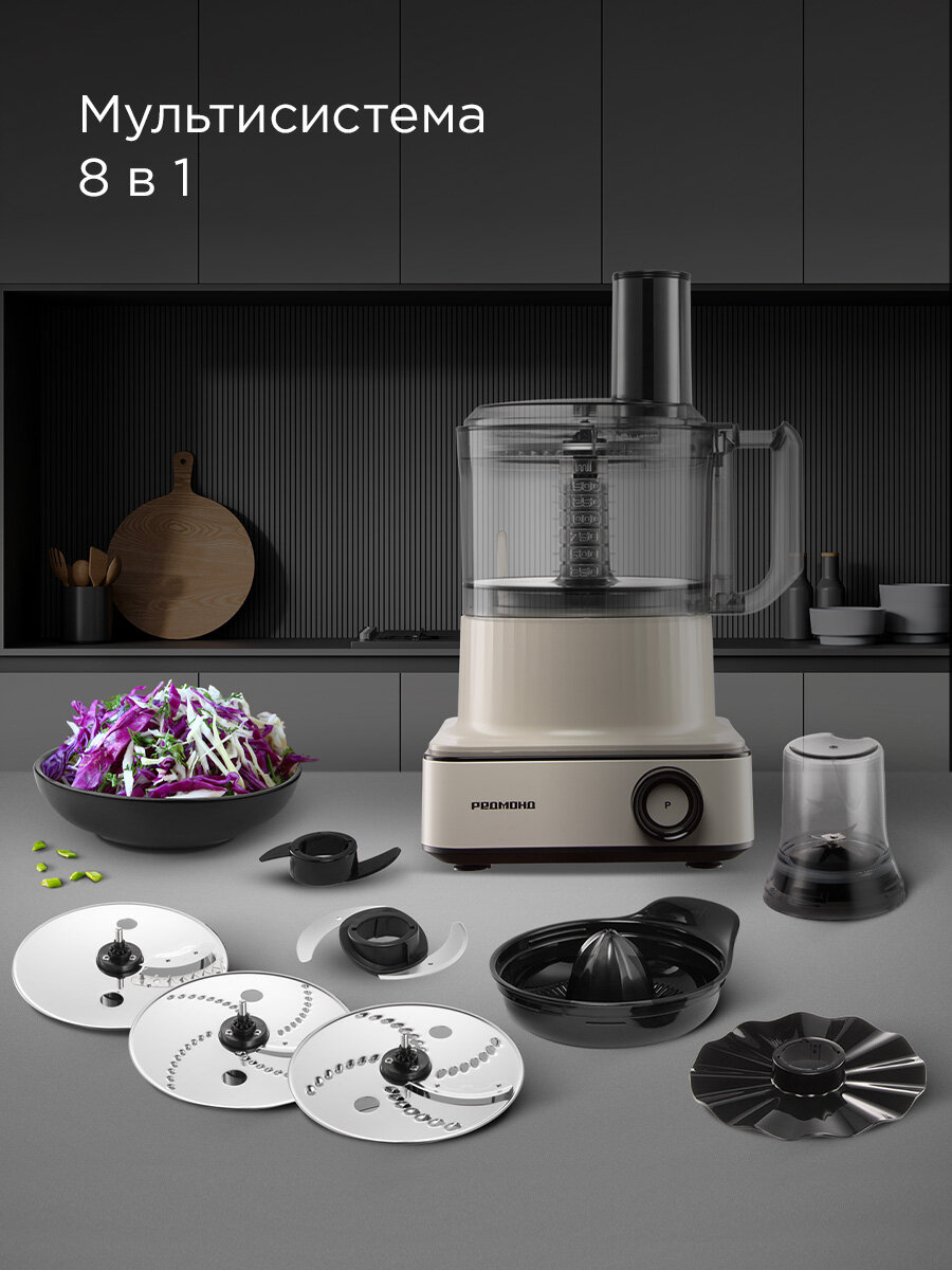 Редмонд FP608 — многофункциональный кухонный комбайн 8 в 1 с объемной чашей на 2300 мл и мощным двигателем. Комплект из 8 насадок для подготовки ингредиентов позволит готовить в больших количествах и с меньшими усилиями. Подойдет большой семье или просто тем, кто делает много салатов, закусок, заготовок на зиму. Комбайн легко измельчает твердые продукты: орехи, кофейные зерна, твердый сыр. Подходит для замешивания жидкого теста и приготовления соусов.