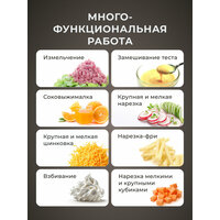 венчик для взбивания, для замешивания теста, для картофеля фри, для нарезки кубиками, для нарезки ломтиками, для нарезки соломкой, насадка-терка, универсальный нож