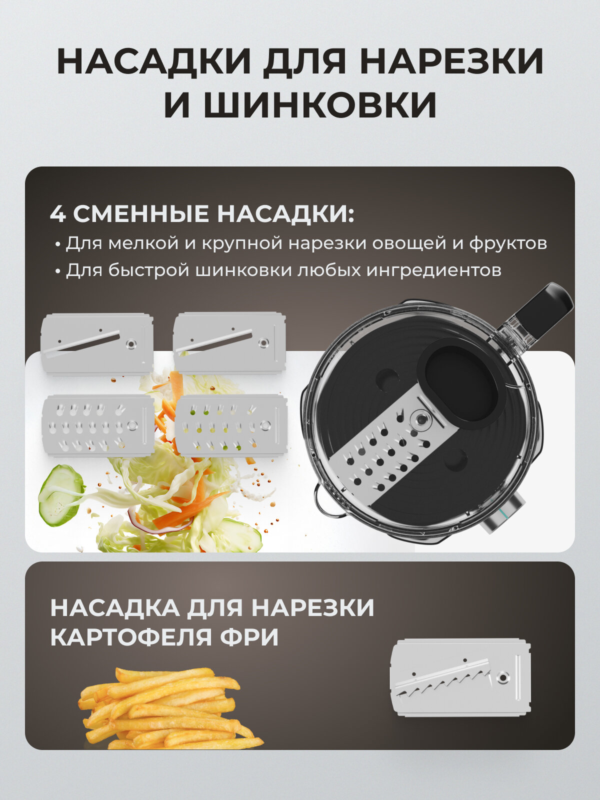 XL-чаша 3,5 л — увеличенный объём для приготовления больших порций. 12 скоростей + импульсный режим — точная настройка под каждую задачу. 2 насадки для нарезки кубиками — аккуратные ровные кусочки без ручной резки. 11 функций в одном устройстве — универсальность и экономия места на кухне. Корпус из нержавеющей стали и система защиты — надёжность, безопасность, долговечность.