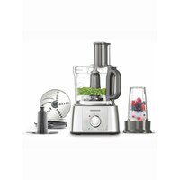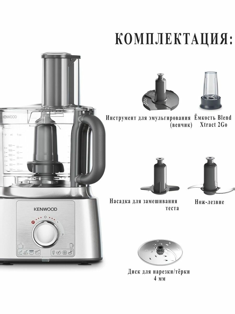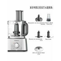 | Подробная комплектация | Основной блок Чаша Крышка с толкателем Стеклянный блендер Нож-измельчитель Диски для шинковки и нарезки Инструкция Переходник в дополнение к оригинальному зарядному устройству |