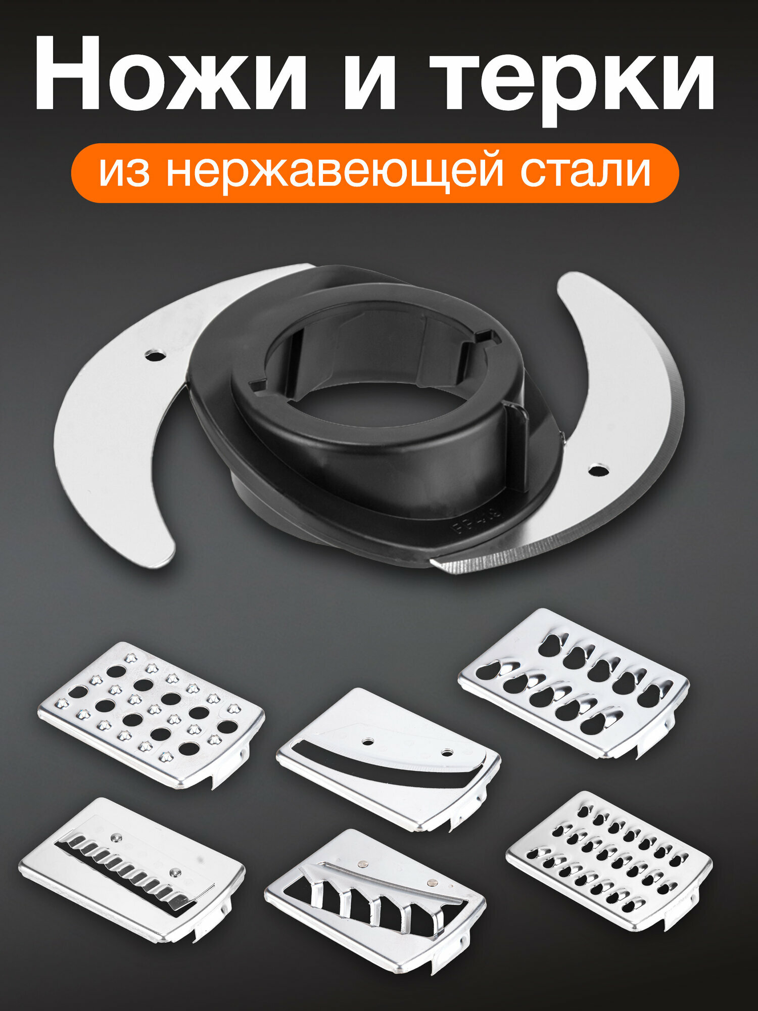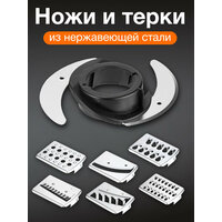 | Насадки | венчик для взбивания, для замешивания теста, для нарезки кубиками, для нарезки ломтиками, для нарезки соломкой, мельничка, мясорубка, насадка-терка, универсальный нож, эмульсионная |