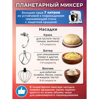 | Насадки | венчик для взбивания, для замешивания теста, для кеббе, для колбасок, для нарезки ломтиками, для нарезки соломкой, для пасты, мельничка, мясорубка, насадка-терка, универсальный нож, эмульсионная |