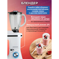 | насадки | венчик для взбивания, для замешивания теста, для кеббе, для колбасок, для нарезки ломтиками, для нарезки соломкой, для пасты, мельничка, мясорубка, насадка-терка, универсальный нож, эмульсионная |