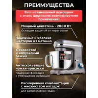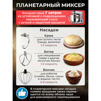 Миксер укомплектован тремя насадками: венчиком для взбивания, насадкой для перемешивания и крюком для теста. Перемешивание происходит в большой чаше (7 л) с ручкой, выполненной из нержавеющей стали и укомплектованной пластиковой защитной крышкой.