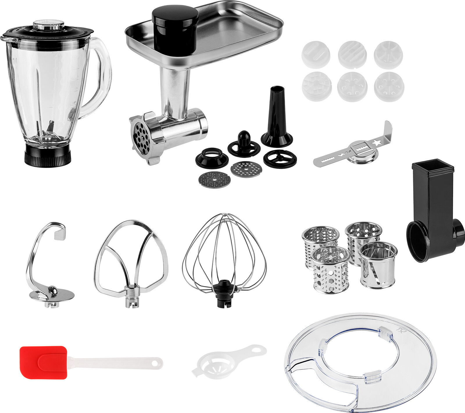 чаша миксера с крышкой, насадка-крюк для теста, насадка для замешивания, насадка-венчик, чаша блендера с крышкой и мерным колпачком, мясорубка в сборе, решетки для мясорубки 3 шт. (3/5/7 мм), корпус овощерезки с толкателем, комплект насадок для овощерезки 4 шт., насадка для приготовления колбас, насадка для приготовления кеббе, насадки для приготовления макарон 6 шт., фигурная насадка для приготовления печенья, отделитель желтка, силиконовая лопатка, руководство по эксплуатации