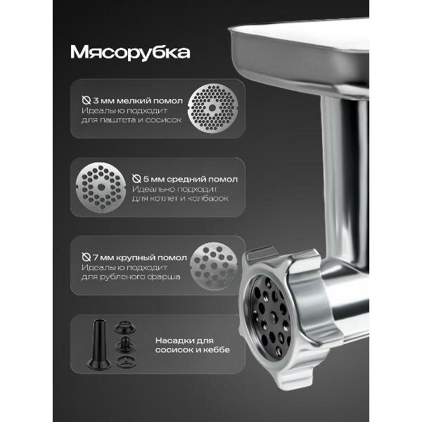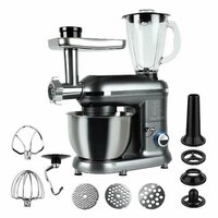 Многофункциональный кухонный комбайн R101-200 заменит сразу несколько бытовых приборов. Он сочетает в себе функции планетарного миксера, мясорубки и большого блендера, значительно расширяя возможности во время приготовления блюд. Обладает мотором в 1500 W, который обеспечивает высокую производительность. Имеет плавный пуск и регулировку из 6 скоростей, что позволяет выбрать оптимальный режим работы. В комплекте удобные насадки для замешивания теста, венчик для взбивания, насадки для электромясорубки и чаша миксера объемом 4.5 л. Все детали выполнены из качественной нержавеющей стали, материал мясорубки - алюминий. Толкатель изготовлен из безопасного пищевого пластика. Мощный электрический комбайн подходит для измельчения мяса, овощей, приготовления смузи и коктейлей, однородного фарша и пюре. Дополнен системой защиты при неправильной сборке. Прорезиненные ножки-присоски обеспечивают хорошее сцепление со столешницей, исключая скольжение при вибрации. Это продлевает срок службы прибора и делает его использования безопасным. Бытовая техника для кухни RAGEX - простое и надежное решение для приятной готовки дома!