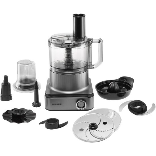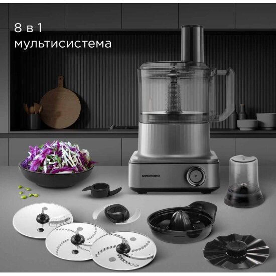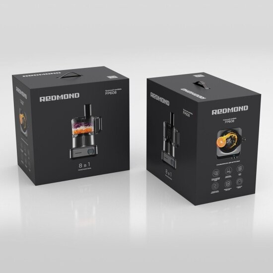 Кухонный комбайн REDMOND FP608 — комбайн 8 в 1 с комплектом сменных насадок — для нарезки, терки, шинкования, отжима сока и перемалывания кофейных зерен. Объем чаши — 2300 мл. Благодаря высокой мощности 1300 Вт комбайн измельчает даже крупно нарезанные и твердые продукты: яблоки, морковь, зерна кофе, орехи. Подходит для приготовления майонеза и заправок. На комбайне вы за считаные минуты нарежете килограммы продуктов для салатов и заготовок.