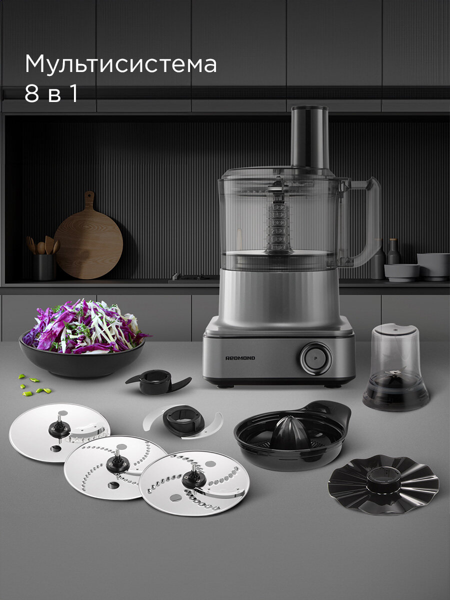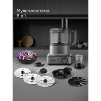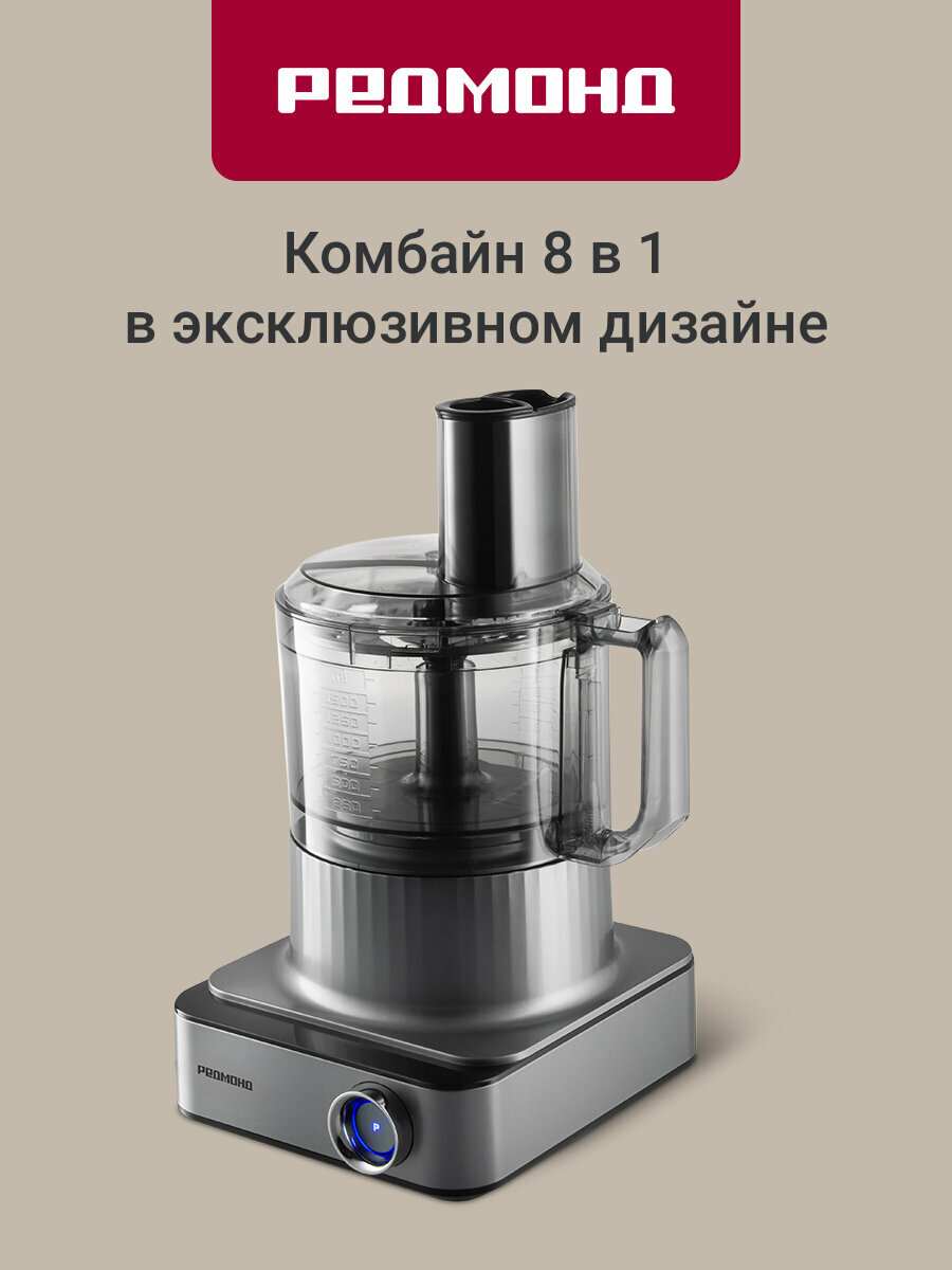 REDMOND FP608 — многофункциональный кухонный комбайн 8 в 1 с объемной чашей на 2300 мл и мощным двигателем. Комплект из 8 насадок для подготовки ингредиентов позволит готовить в больших количествах и с меньшими усилиями. Подойдет большой семье или просто тем, кто делает много салатов, закусок, заготовок на зиму. Комбайн легко измельчает твердые продукты: орехи, кофейные зерна, твердый сыр. Подходит для замешивания жидкого теста и приготовления соусов.