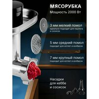 | насадки | венчик для взбивания, для замешивания теста, для кеббе, для колбасок, для нарезки ломтиками, для нарезки соломкой, для пасты, мельничка, мясорубка, насадка-терка, универсальный нож, эмульсионная |