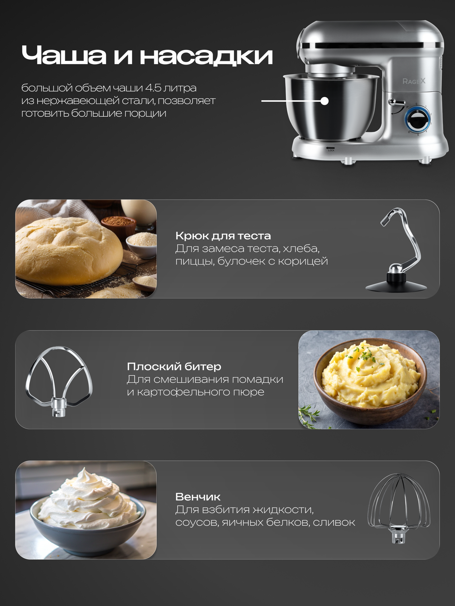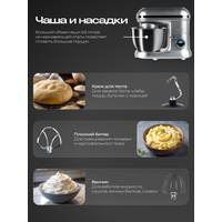 - Планетарный миксер. Без труда замешивает любое тесто. Объем чаши на 4.5 л позволит смешать сразу большое количество продуктов. Отлично подойдет как для большой семьи, так и для кондитеров, делающих десерты на заказ. Корпус чаши изготовлен из нержавеющей стали, не впитывает запахи и жиры. При правильной эксплуатации прослужит вам долгие годы.