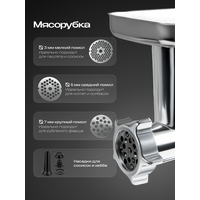 - Мясорубка. Благодаря ей, вы легко перекрутите любой вид мяса в фарш. Используя дополнительные насадки (которые необходимо приобретать отдельно), можно приготовить колбаски, кеббе и даже фигурное печенье.