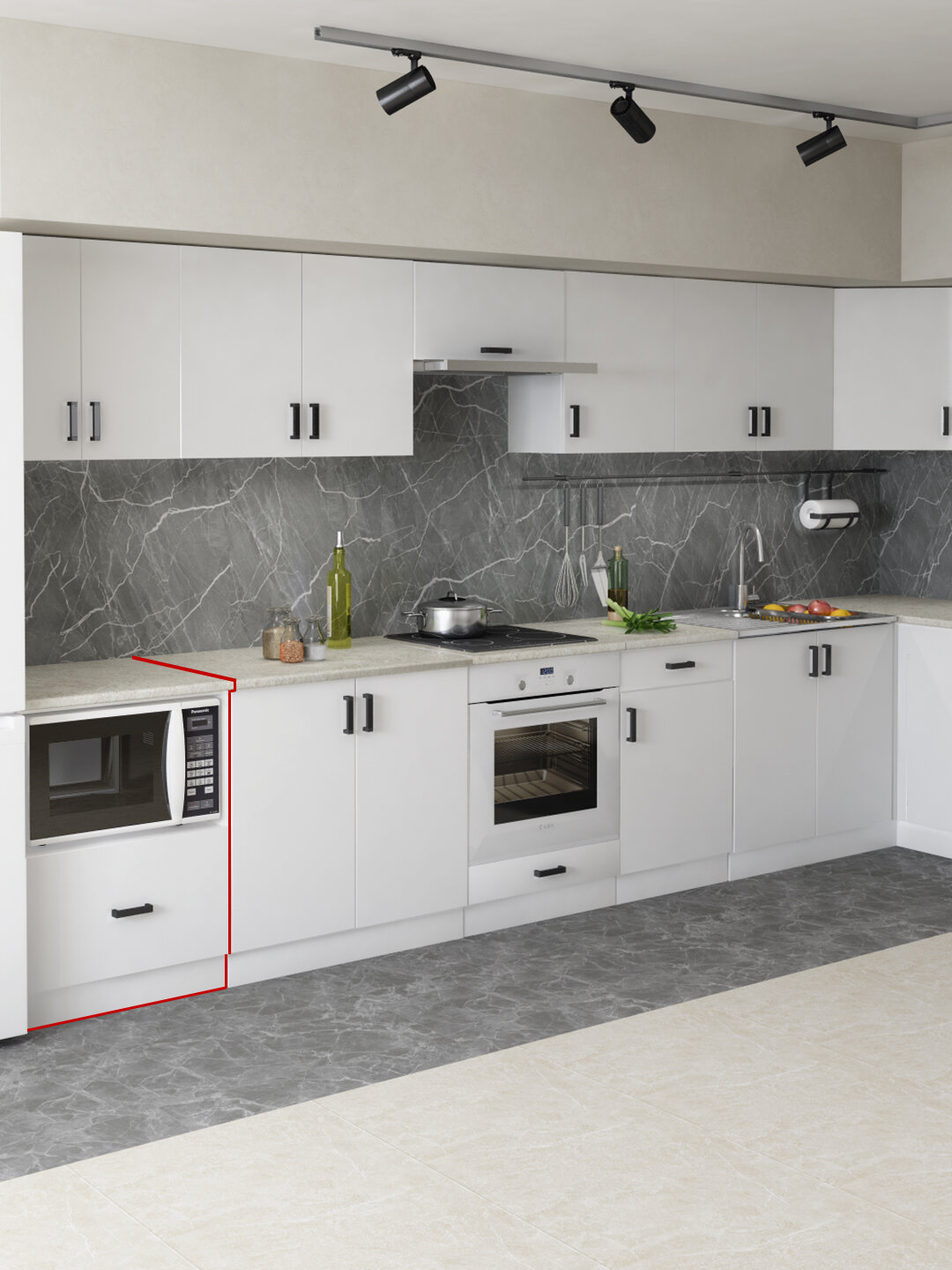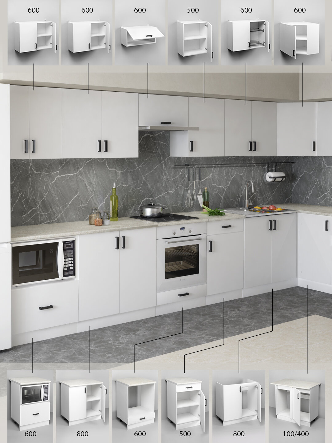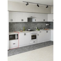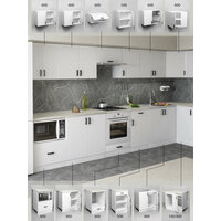 Наша кухня Орион изготовлена полностью из белого матового ЛДСП, ручка пластиковая черная скоба, в модулях с ящиками использованы роликовые направляющие, петли с доводчиками для плавного и бесшумного закрывания, столешница (цвет – Королевский опал светлый) идет в комплекте.