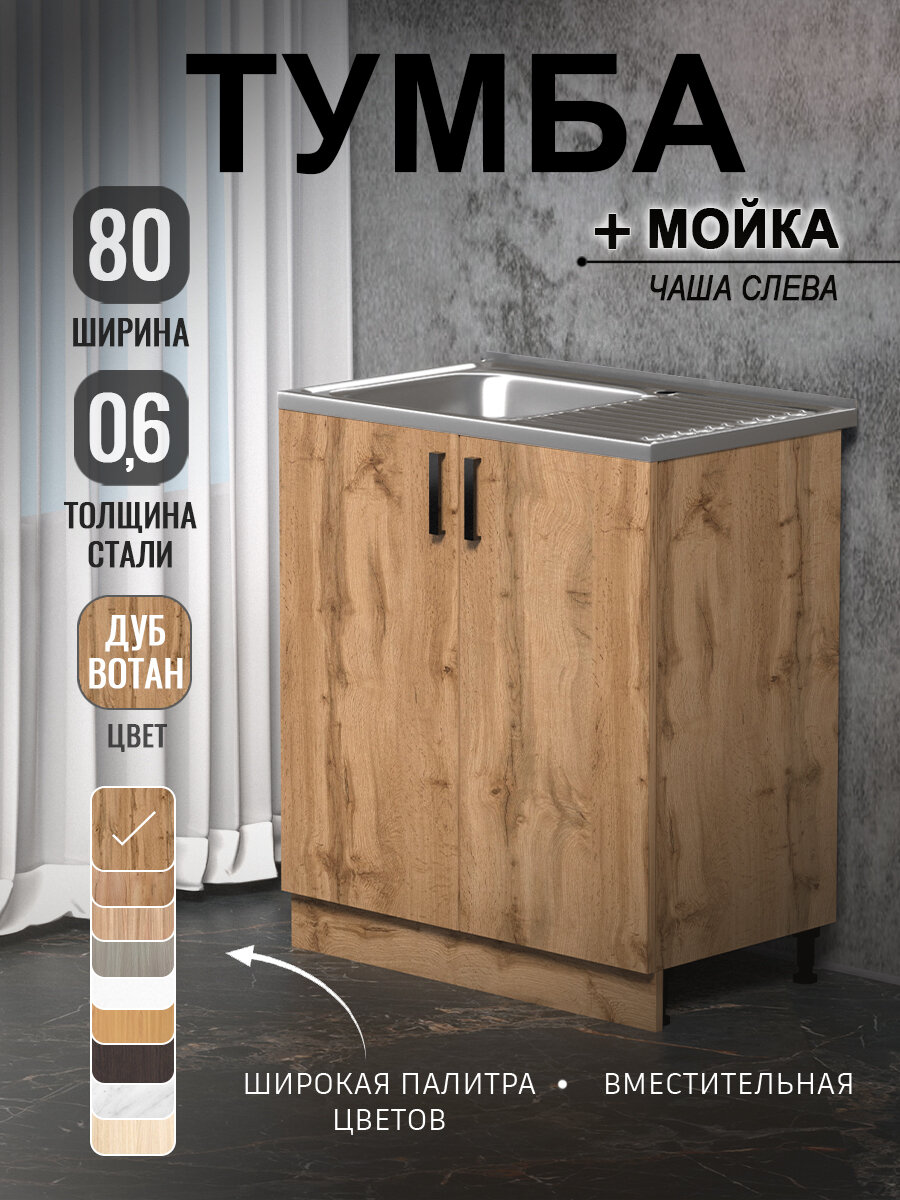 Кухонный модуль, Комплект, Тумба на кухню 80х82х43,6 с мойкой 80х50, чаша слева, 0,6 мм, дуб вотан: сравнение цен, характеристики, фото, актуальное наличие и цены.