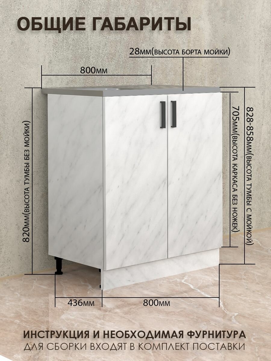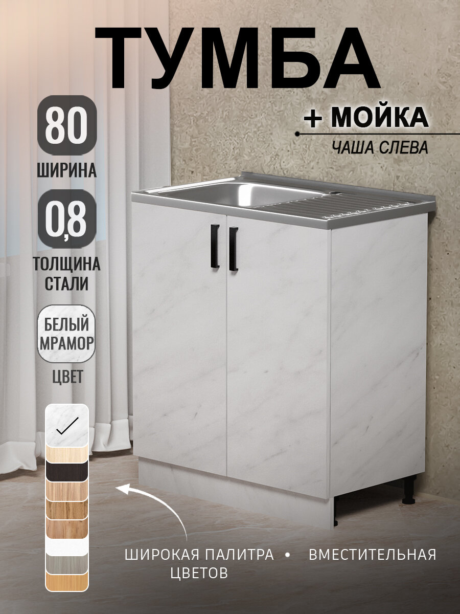 Кухонный модуль, Комплект, Тумба на кухню 80х82х43,6 с мойкой 80х50, чаша слева, 0,8 мм, белый мрамор: сравнение цен, характеристики, фото, актуальное наличие и цены.
