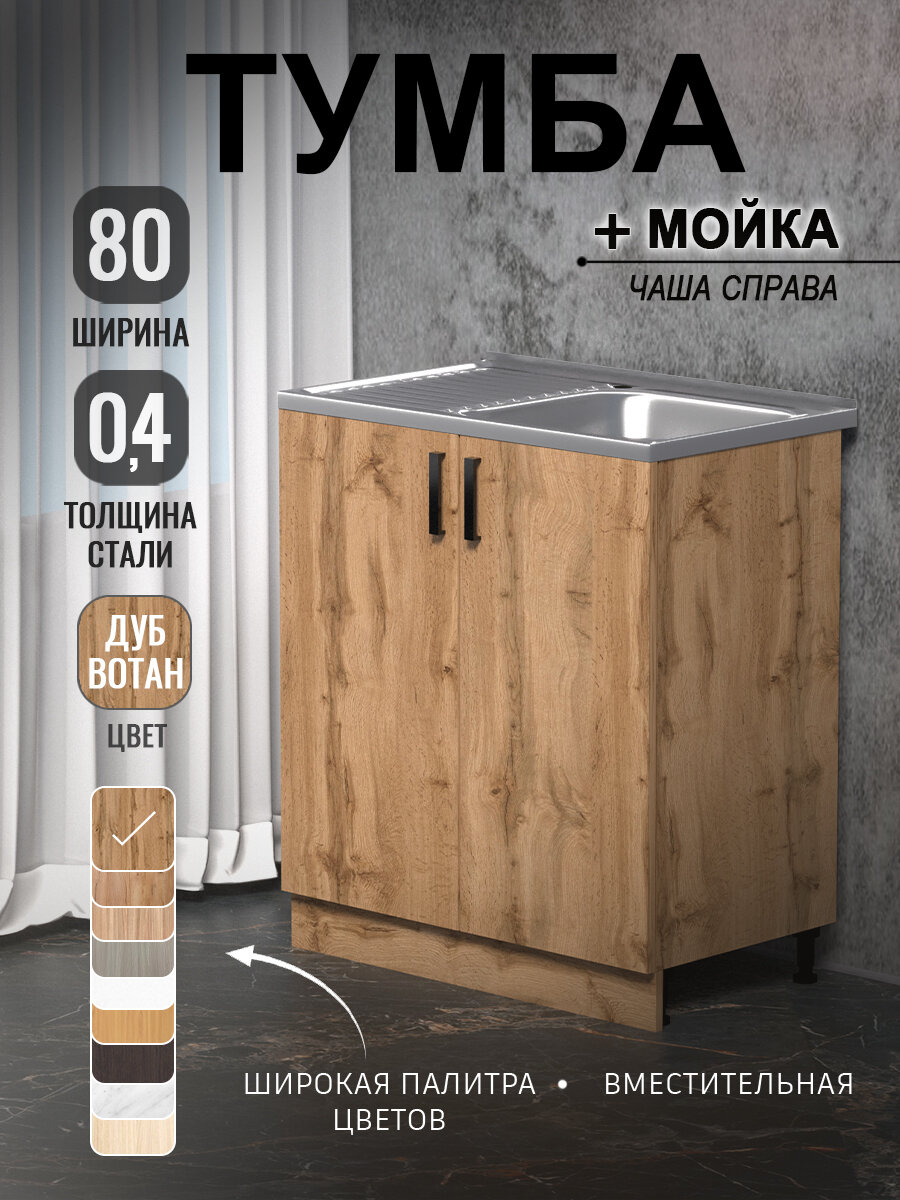 Кухонный модуль, Комплект, Тумба на кухню 80х82х43,6 с мойкой 80х50, чаша справа, 0,4 мм, дуб вотан: сравнение цен, характеристики, фото, актуальное наличие и цены.