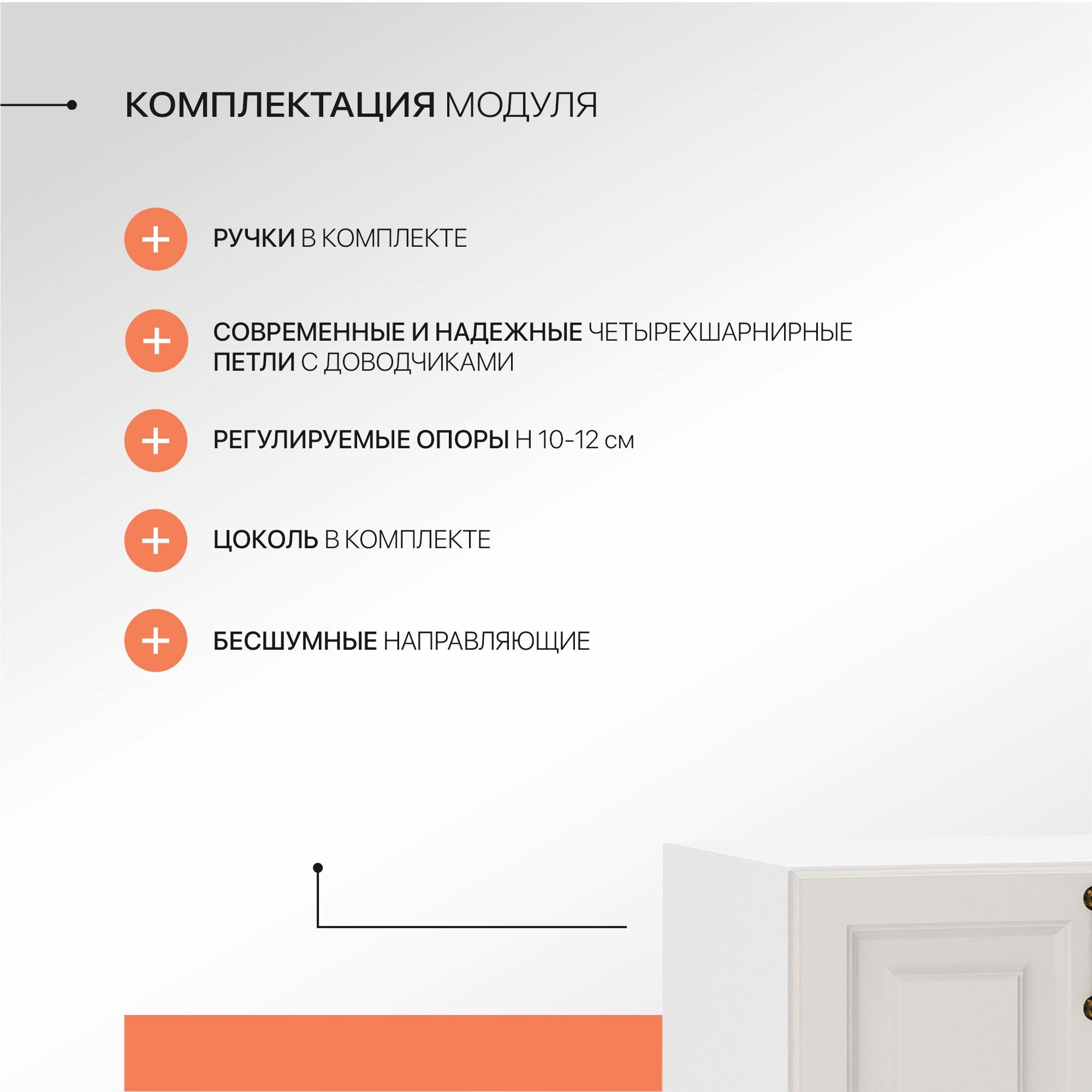Данный кухонный модуль может использоваться самостоятельно, либо в комбинации с другими навесными кухонными шкафами и напольными тумбами, создавая полноценный кухонный гарнитур. При этом не требуется создание сложного проекта, достаточно выбрать необходимые вам модули для кухни или воспользоваться одним из готовых решений, представленных в нашем магазине.