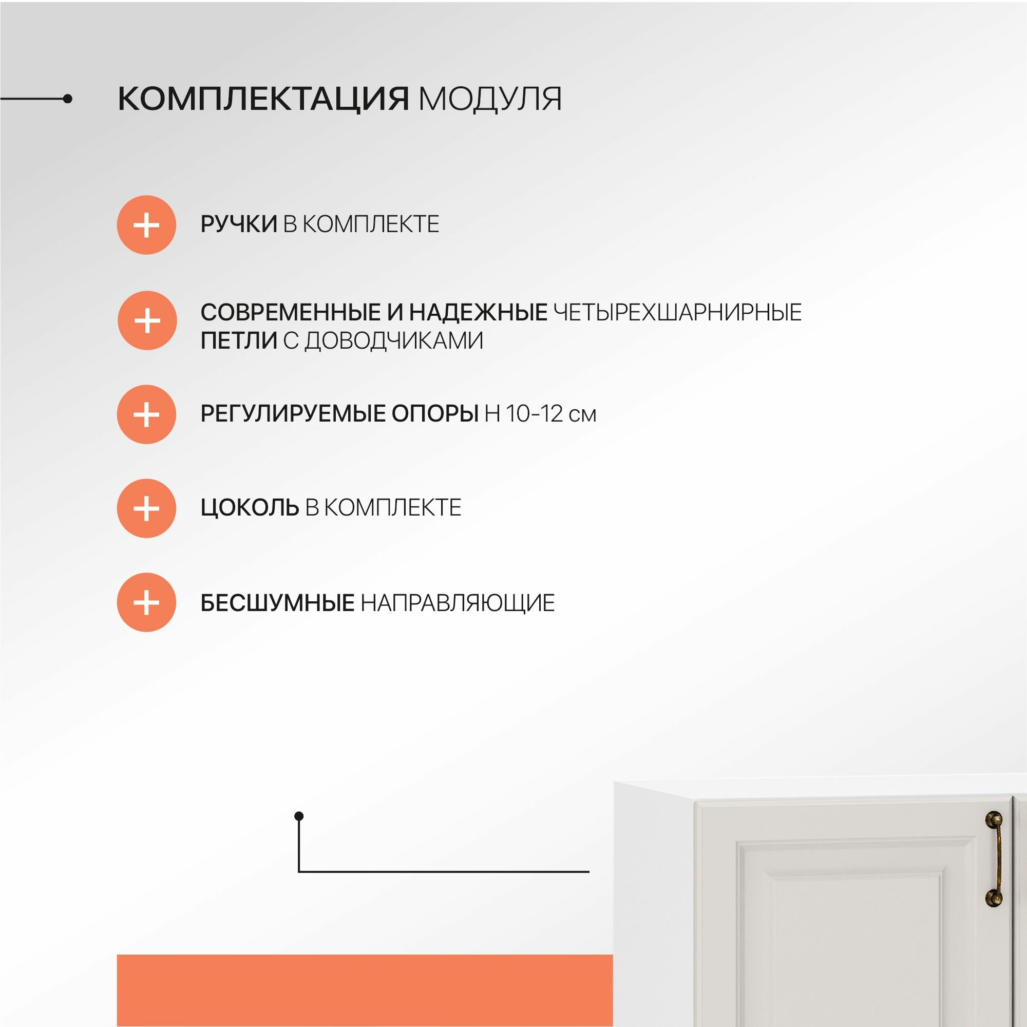 Данный кухонный модуль может использоваться самостоятельно, либо в комбинации с другими навесными кухонными шкафами и напольными тумбами, создавая полноценный кухонный гарнитур. При этом не требуется создание сложного проекта, достаточно выбрать необходимые вам модули для кухни или воспользоваться одним из готовых решений, представленных в нашем магазине.