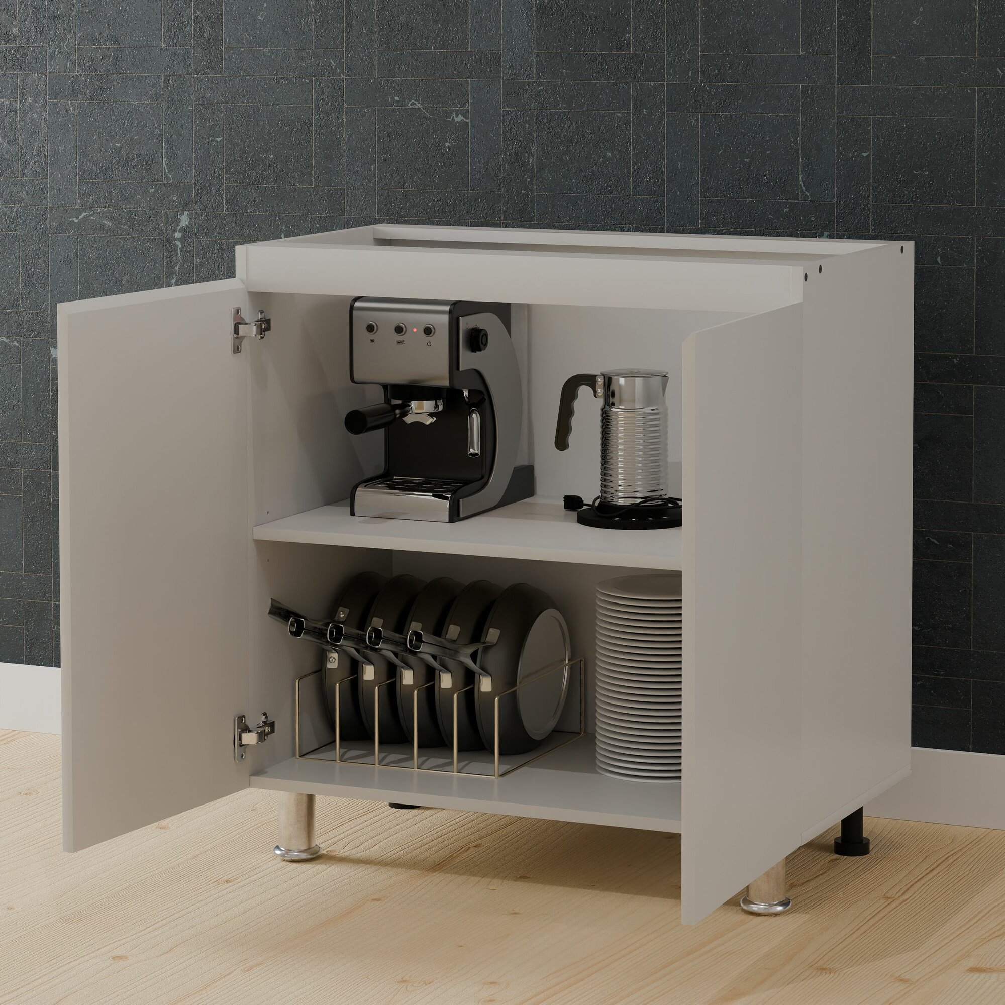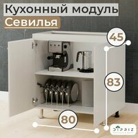 Конструкция кухонного модуля оснащена 2 распашными дверями и одной регулируемой по высоте съемной полкой. Размеры шкафа под кухню в собранном виде (Ширина х Глубина х Высота, см) - 80х44.8х82.5 см, что позволит использовать его как в качестве небольшой кухонной тумбы, так и для создания полноценного кухонного гарнитура серии Севилья. Обратите внимание, что этот вариант модуля кухни поставляется без столешницы.