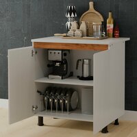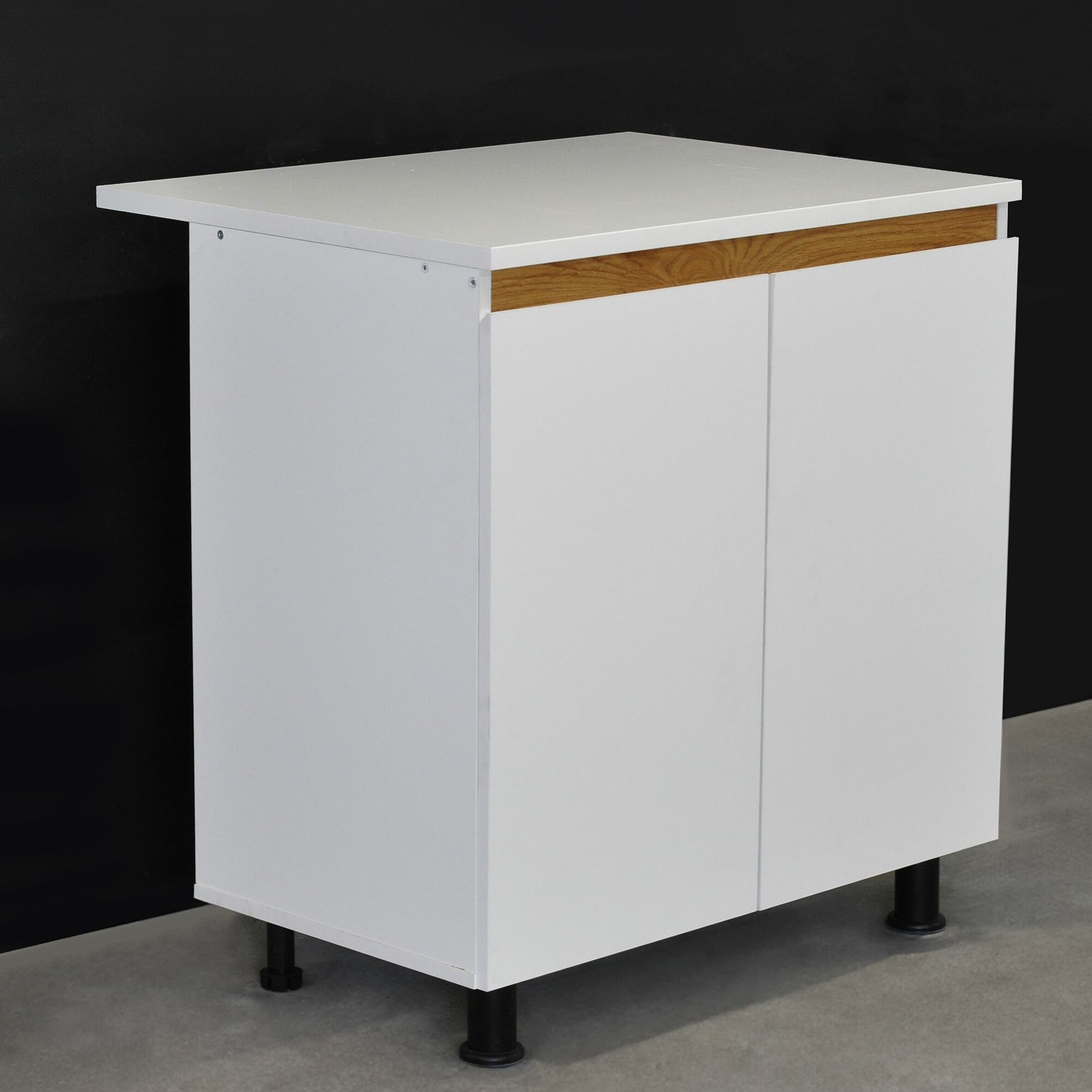Тумба на кухню изготовлена из качественного ламинированного ДСП (ЛДСП) с декоративными вставками из массива дуба, что обеспечивает долговечность и привлекательный внешний вид. При изготовлении шкафа использовалось только безопасное для человека ЛДСП в соответствии с европейскими нормами классов содержания формальдегида (не более 10 мг на 100 г). Имеет нежный белый цвет, поэтому мебель всегда будет придавать комнате приятный и светлый внешний вид. Задняя стенка выполнена из белого ДВП с целью облегчения конструкции, делая её более привлекательной и долговечной.