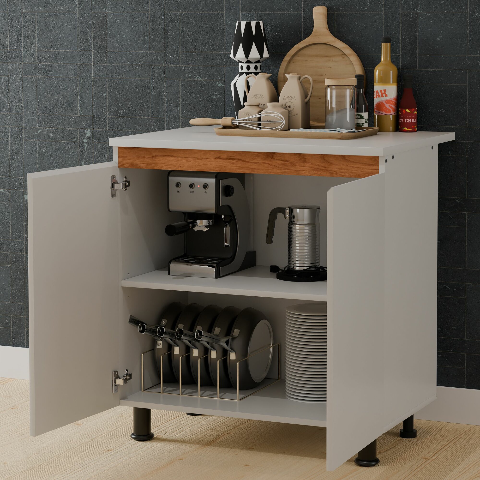 Двери оснащены петлями с доводчиком производителя Boyard, что обеспечивает легкость и плавность закрывания. Скрытые ручки с гладкими скосами позволят использовать кухонный модуль с удовольствием, предоставляя легкость доступа и уборки. Съемная полка может устанавливаться в 3 положениях и рассчитана на нагрузку до 5-10 кг, что позволяет хранить тяжелые кухонные принадлежности без опасений.