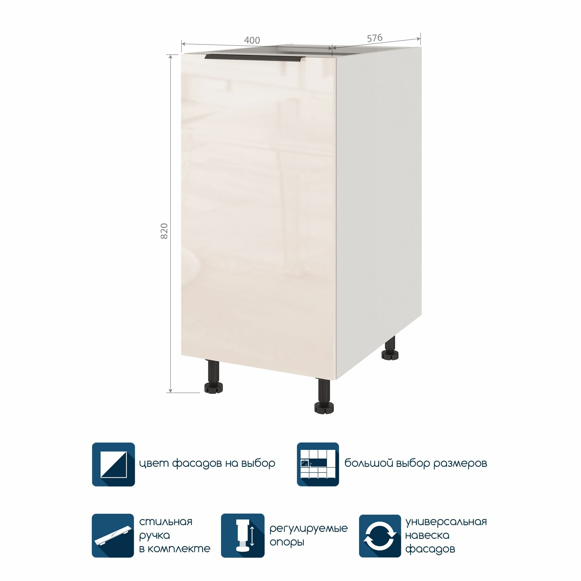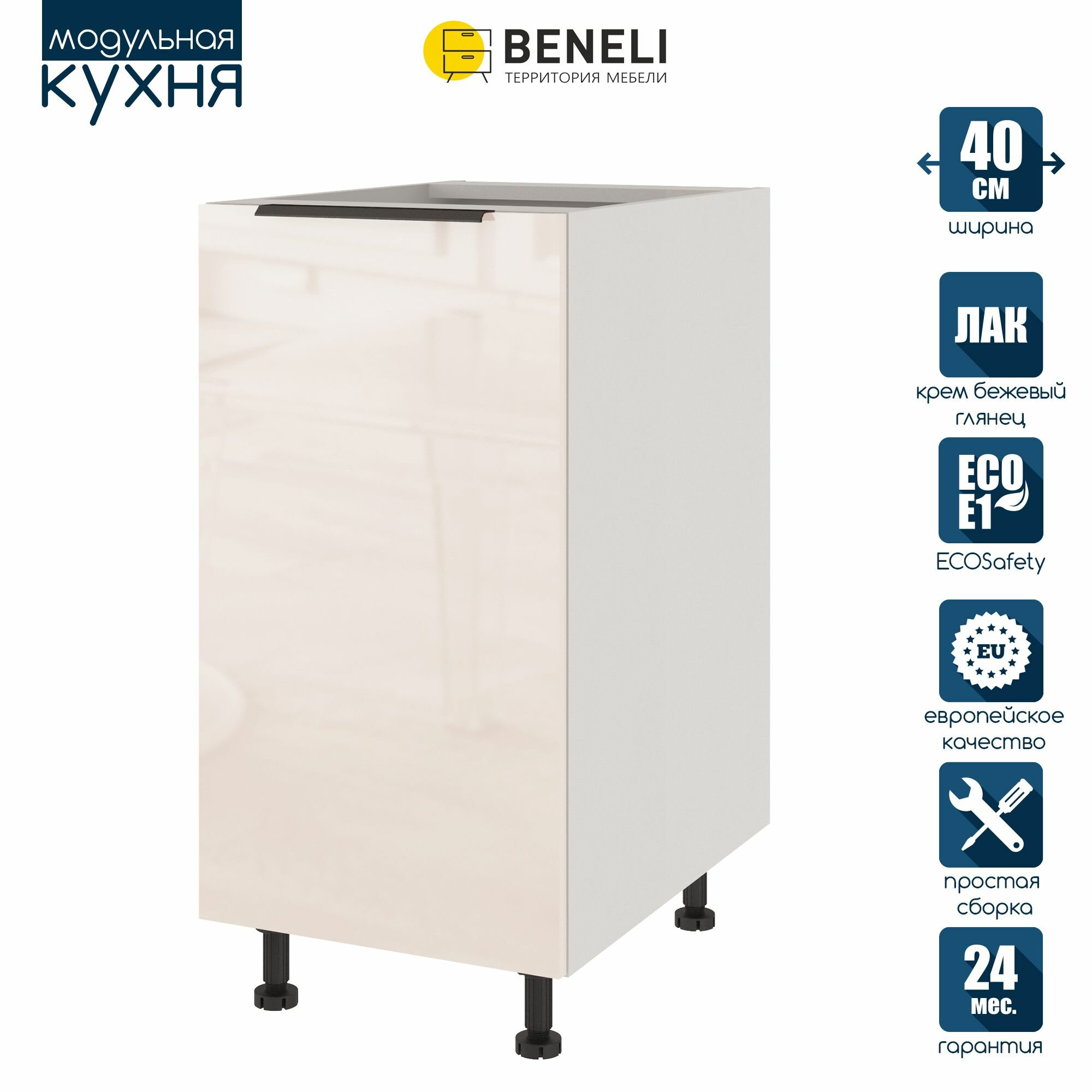 Кухонный модуль шкаф напольный Beneli COLOR с доводчиком Крем бежевый глянец/Белый 40х576х82 см для кухни поможет создать идеальный кухонный гарнитур для вашей квартиры дома или дачи. Мы предлагаем приобрести кухонный модуль отдельно и дополнить его тем, что нужно именно вам: напольный или навесной шкаф для крепления на стену, тумба, торцевой шкаф или бутылочница, угловой шкаф или шкаф пенал, шкаф или пенал для встраиваемой техники. Все это вы сможете подобрать по вашим габаритам, размерам и цвету. Она идеальна для тех, кто хочет максимально использовать пространство на кухне и создать функциональный и удобный интерьер. Кухонный шкаф может использоваться как кухонный остров это позволит создать единый стиль интерьера и обеспечивает функциональность помещения. Кроме того, кухонные шкафы могут быть дополнены другими элементами, такими как столешница декоративная фурнитура или система хранения которая поможет максимально использовать пространство, предназначенное для кухонного гарнитура и передать общий стиль вашего дома Представляем вам модульную систему кухни "Колор" для вашего дома - прекрасное решение для создания вашего кухонного уголка. Кухня Колор - это модульная система мебели, комплект из отдельных блоков, которую можно легко собрать в единое, идеально подходящее вам пространство для хранения продуктов в вашем шкафу. В нашем ассортименте вы найдете огромный выбор напольных и подвесных корпусов с дверцами всех типов и размеров, которые позволяют максимально удобно хранить посуду и использовать пространство кухни.