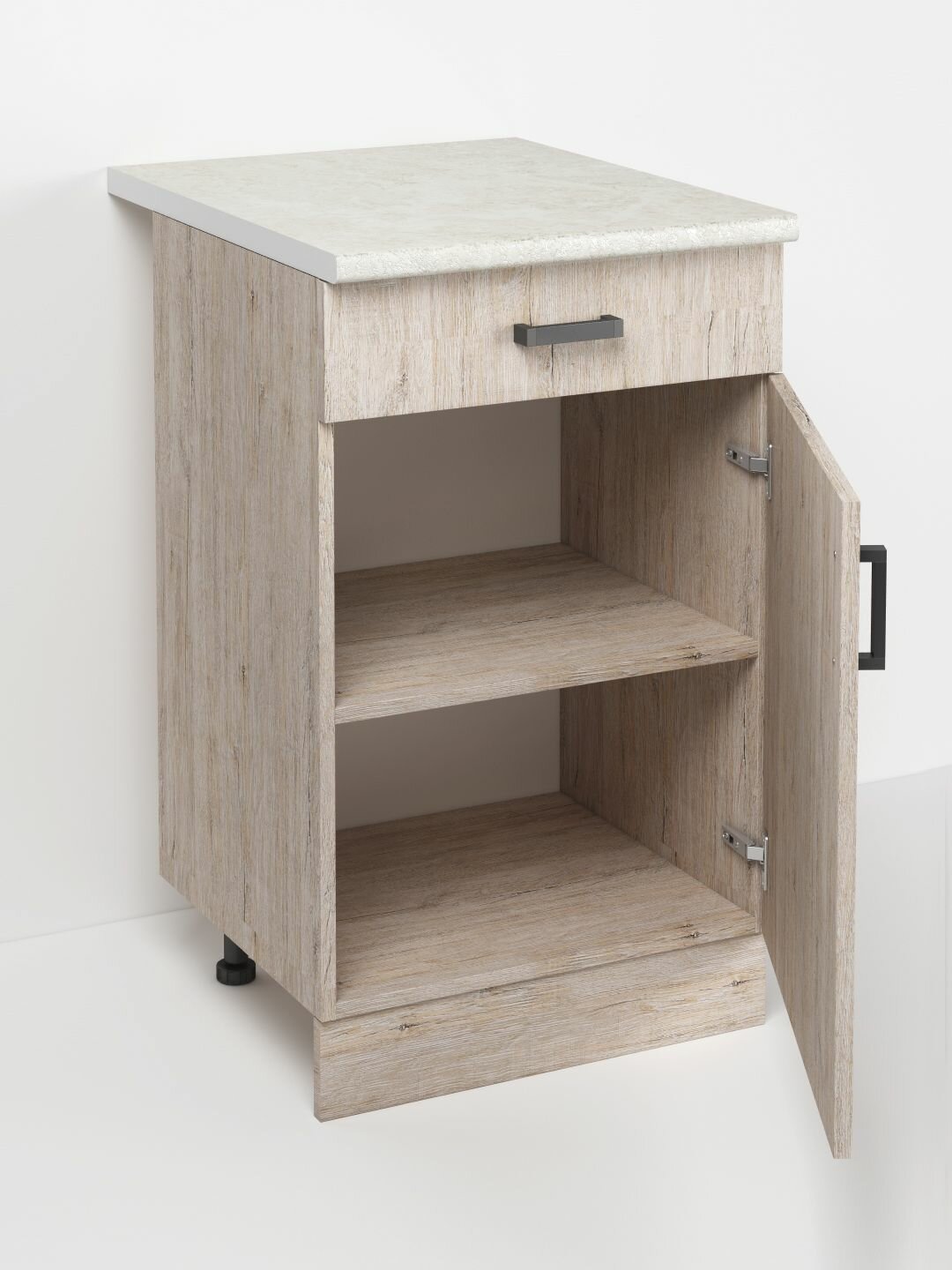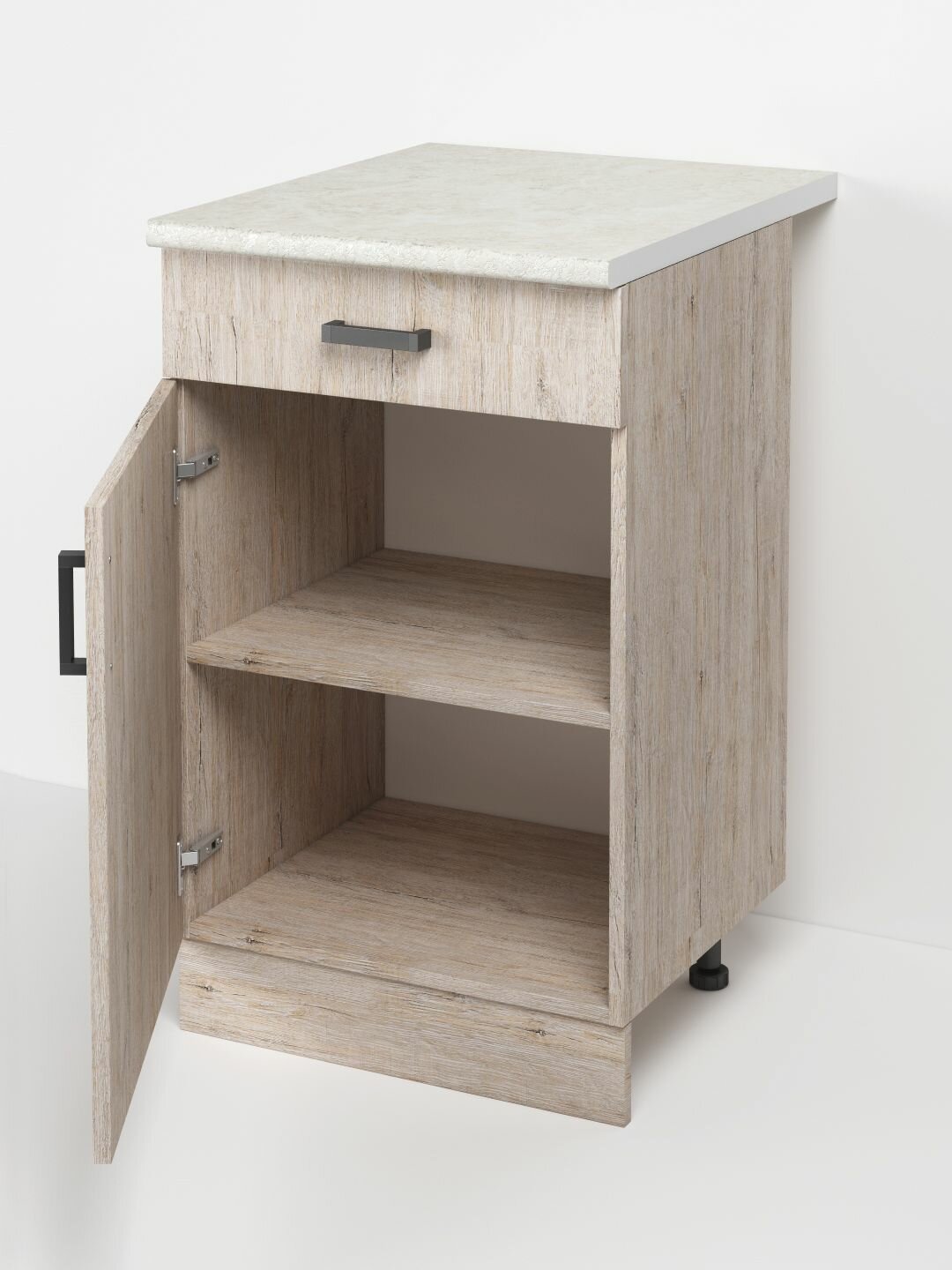 Кухня Пикар — это стильное и универсальное решение для любого интерьера. Она создаёт ощущение чистоты, свежести и простора и идеально подходит для небольших помещений, так как светлые оттенки визуально расширяют пространство. Мы подобрали для Вас самые универсальные модули и объединили их в готовые и практичные решения. Наличие всех необходимых модулей позволит Вам создать комфортный уют для себя и своей семьи. Наша кухня изготовлена полностью из матового ЛДСП цвета пикар, ручка пластиковая черная скоба, в модулях с ящиками использованы роликовые направляющие, петли с доводчиками для плавного и бесшумного закрывания, столешница (цвет – Королевский опал светлый) идет в комплекте. Модуль – Рабочий стол 1 дверь 1 ящик на 50см, доставляется в разборе с подробной инструкцией. Обратите внимание – дверь может быть, как с правым, так и с левым открыванием, решаете при сборке!