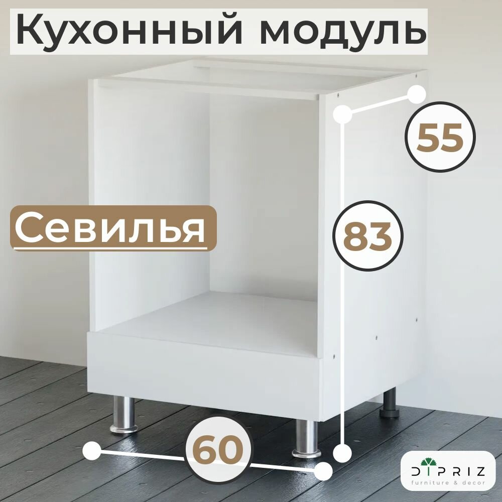 Конструкция панели под духовой шкаф оснащена открытой задней стенкой для монтажа необходимых коммуникаций и ящиком в нижней части. Размеры кухонного шкафа в собранном виде (Ширина х Глубина х Высота, см) - 60х55х82.5 см, что позволит использовать его как в качестве небольшой кухонной тумбы, так и для создания полноценного кухонного гарнитура серии Севилья. Ящик выполнен на металлических роликовых направляющих и выдерживает нагрузку до 5 кг. Вариант модуля под духовой шкаф поставляется без столешницы.