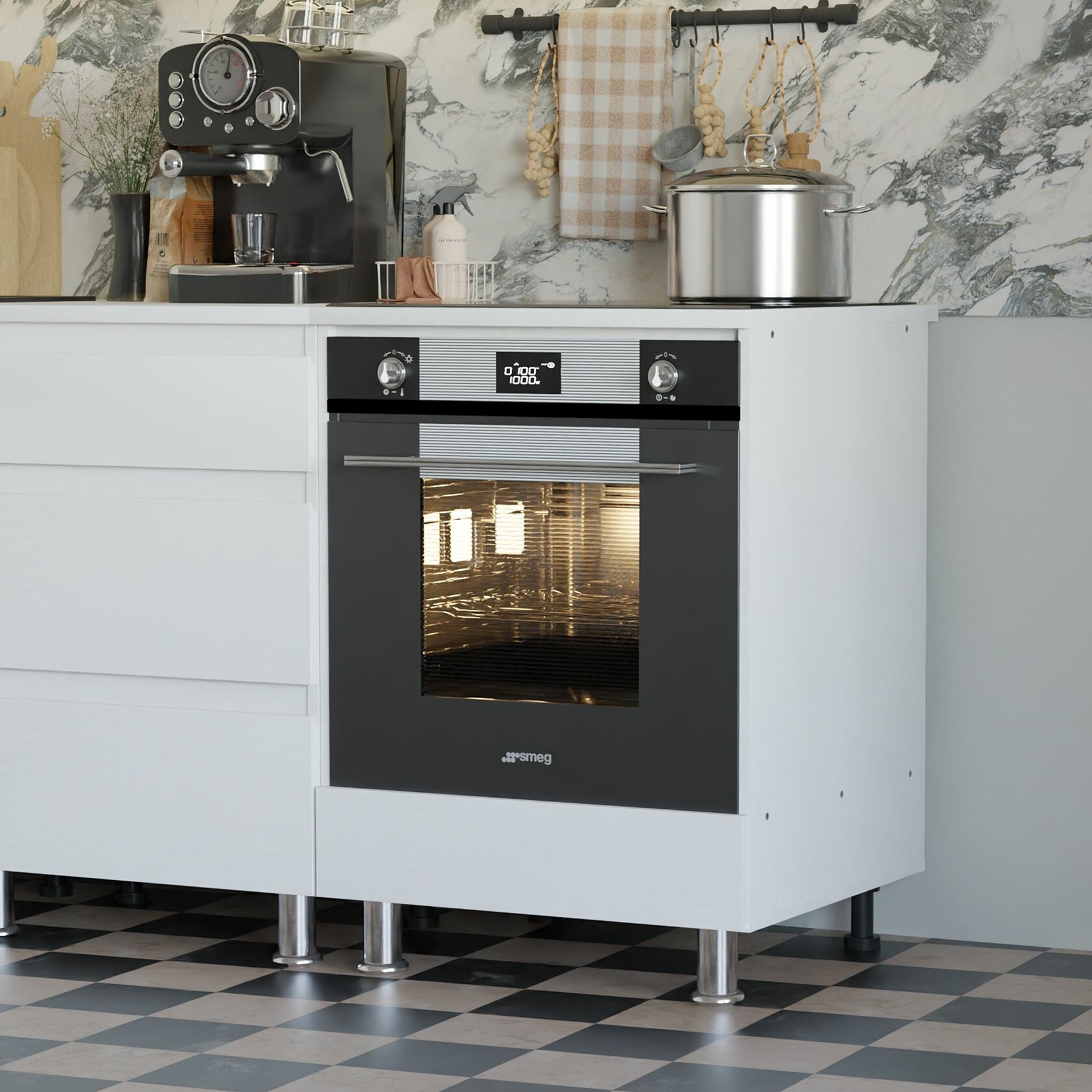 Модуль под духовой шкаф оснащен достаточным пространством для размещения большинства современных духовых шкафов. Открытая задняя стенка рассчитана на монтаж необходимых коммуникаций, дно белого шкафа под духовой шкаф выдержит необходимую нагрузку, что позволит использовать его без опасений. Вместительный ящик под духовым шкафом позволит организовать все кухонные приборы в чистоте и порядке