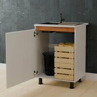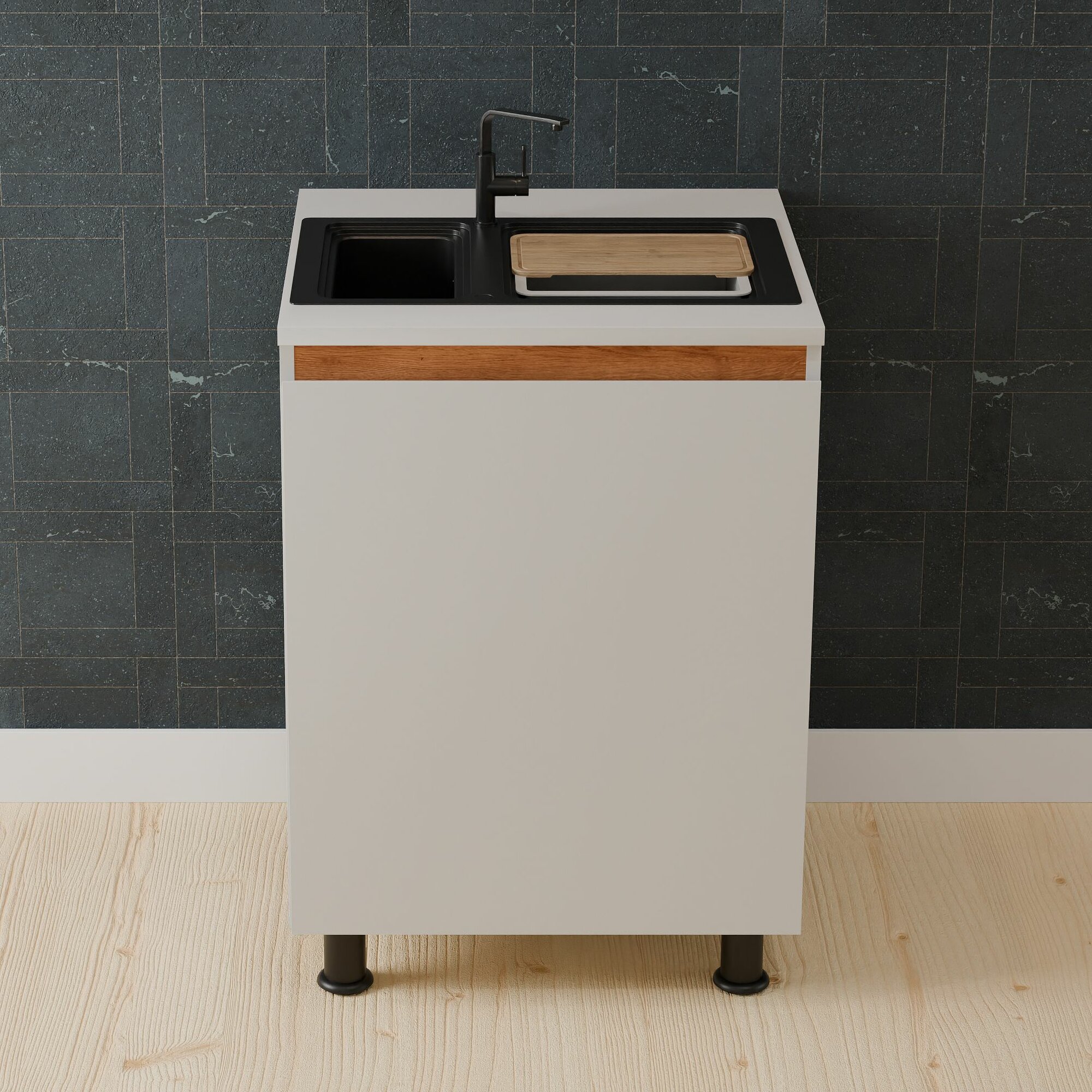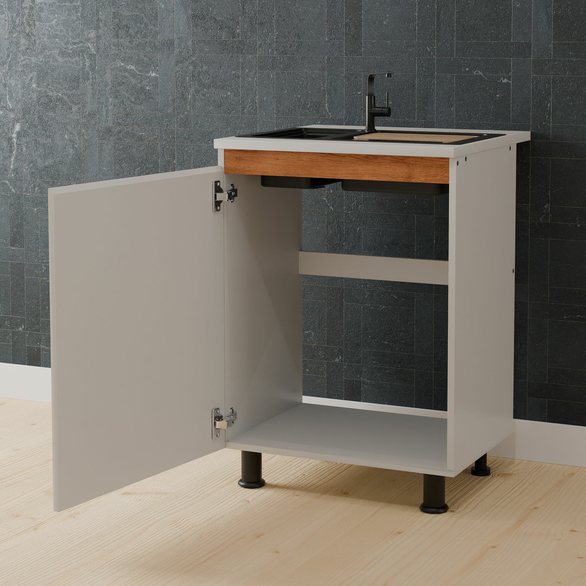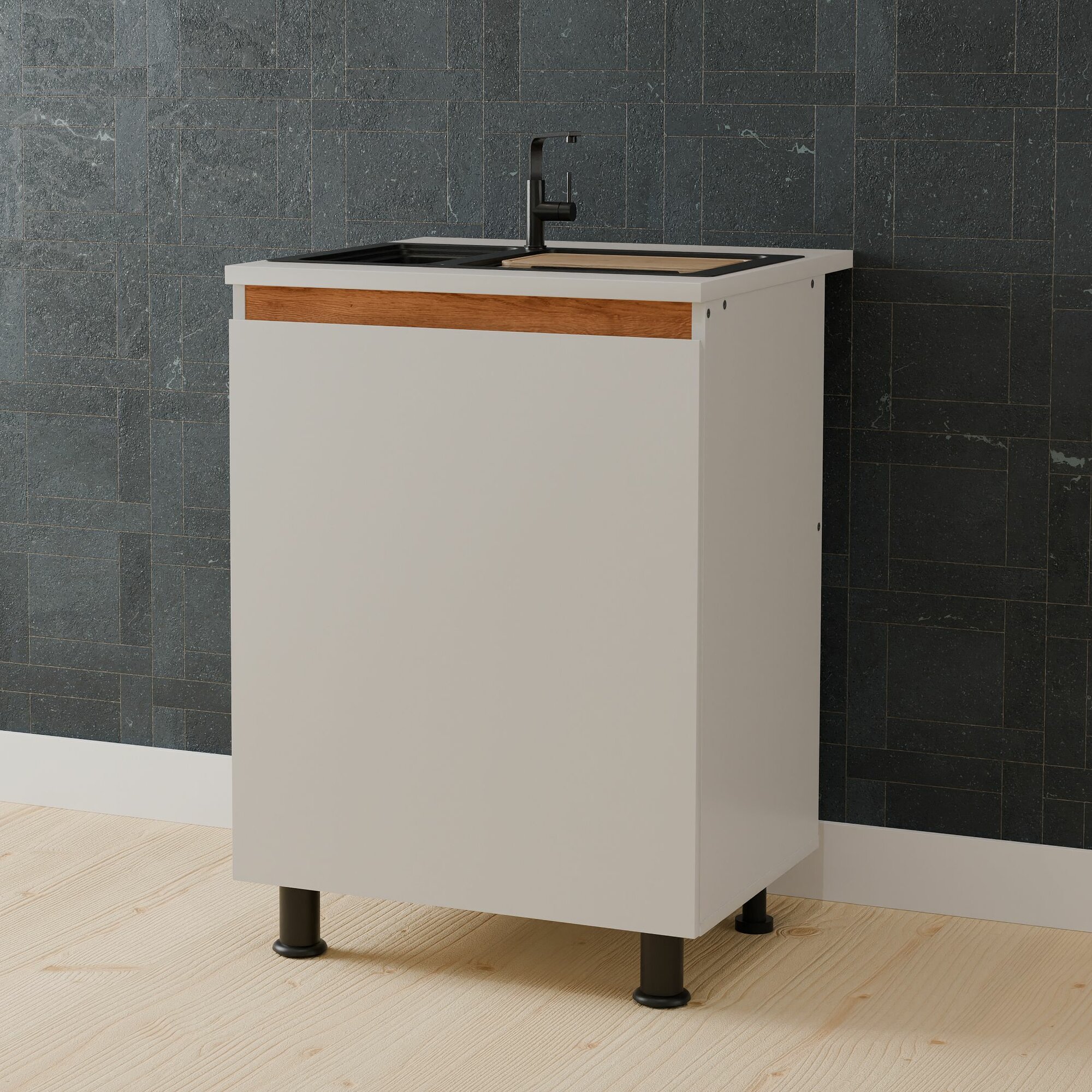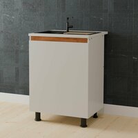 Конструкция тумбы под раковину оснащена распашной дверью и открытой задней стенкой для монтажа необходимых коммуникаций. Размеры кухонного шкафа в собранном виде (Ширина х Глубина х Высота, см) - 60х60х85 см, что позволит использовать его как в качестве небольшой кухонной тумбы, так и для создания полноценного кухонного гарнитура серии Валенсия. Вариант тумбы под раковину поставляется со столешницей размерами 60х60 см, толщина - 22 мм. Столешница выполнена с гладкими краями и кромками, что предотвращает случайные травмы и удары при использовании.