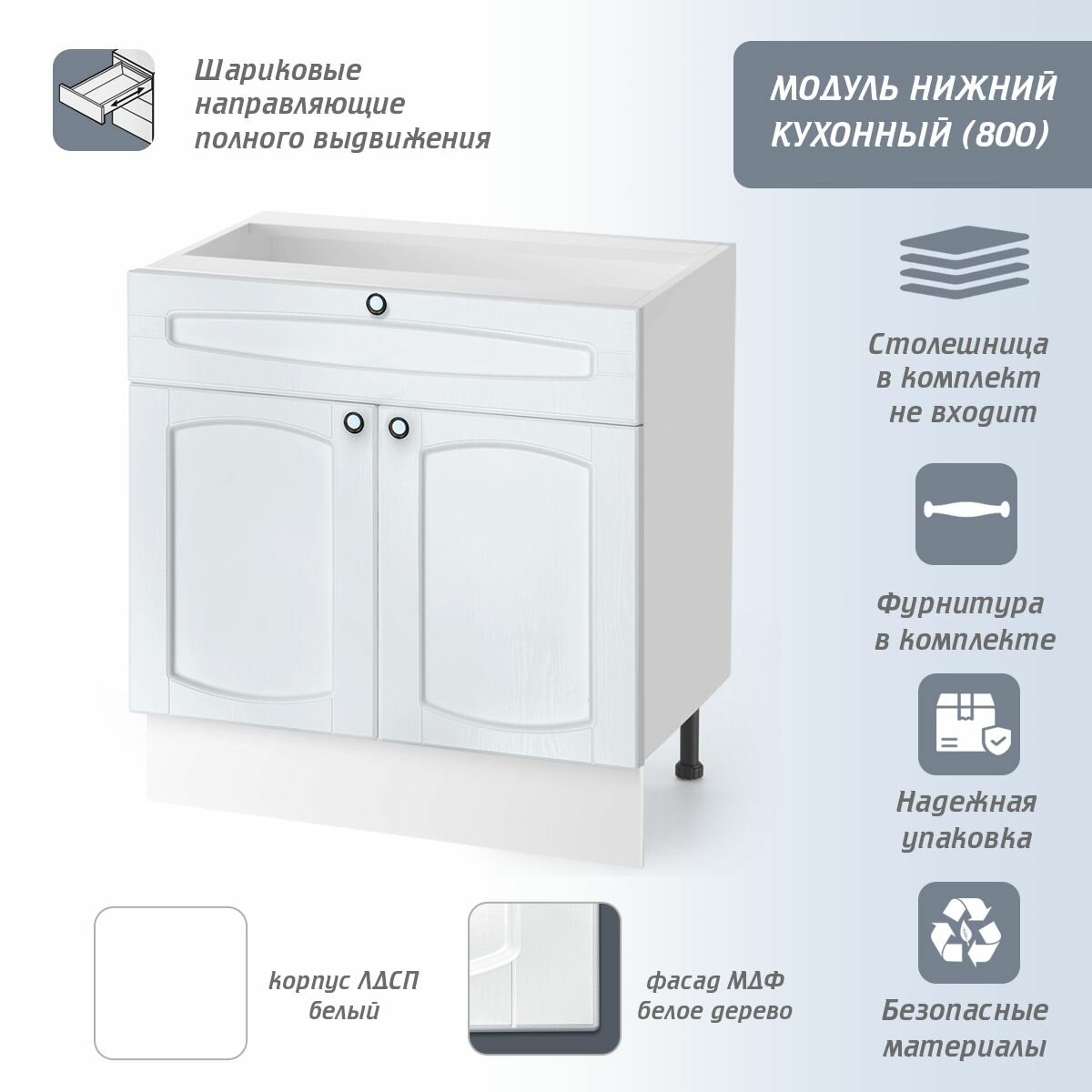 Удобная столешница: модуль оснащен столешницей из ЛДСП, что делает его удобным для приготовления пищи и хранения кухонных принадлежностей.
