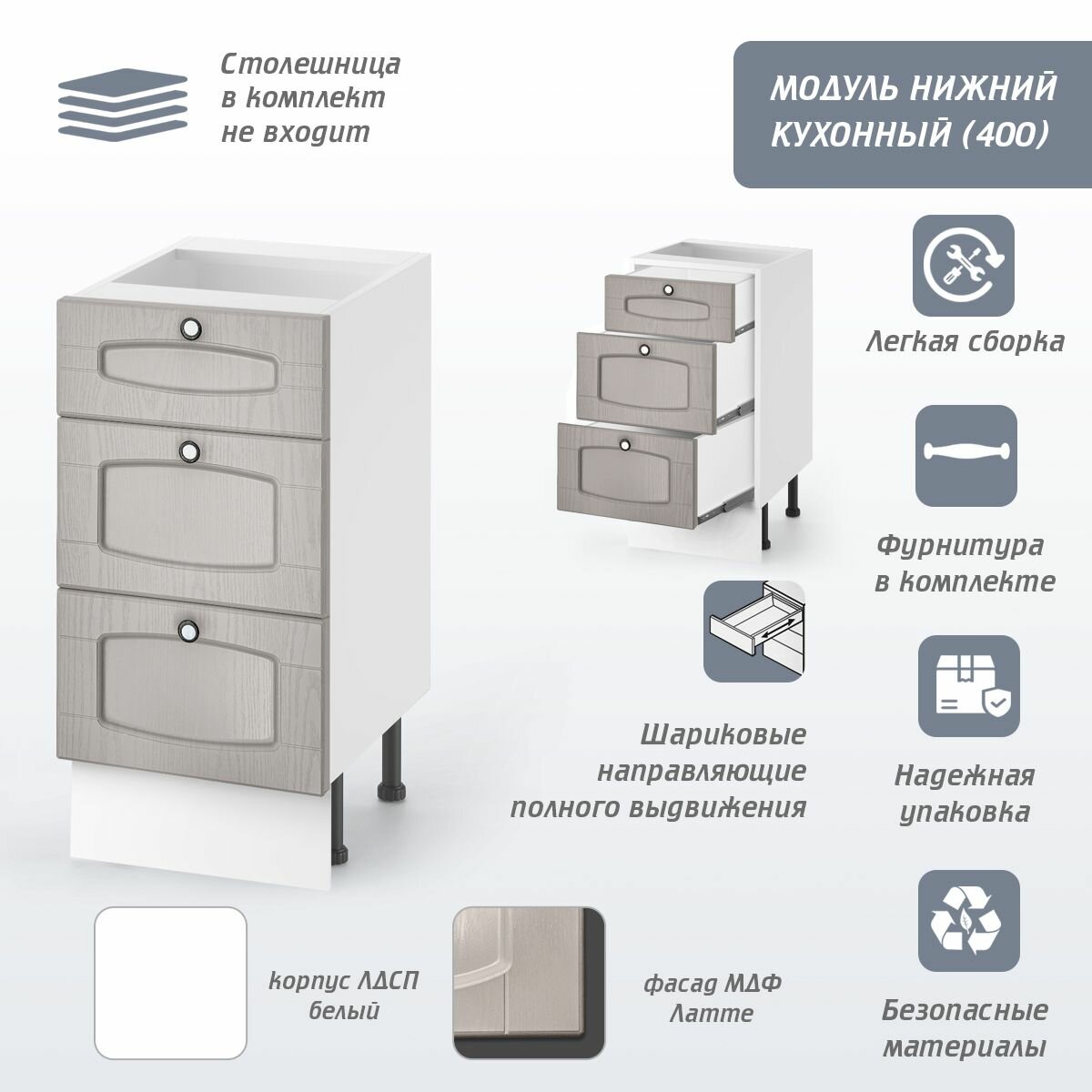 Кухонный модуль напольный с 3 ящиками «Питерские кухни», 40 см, цвет Латте, ЛДСП, фасад МДФ: сравнение цен, характеристики, фото, актуальное наличие и цены.