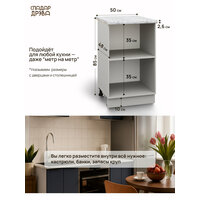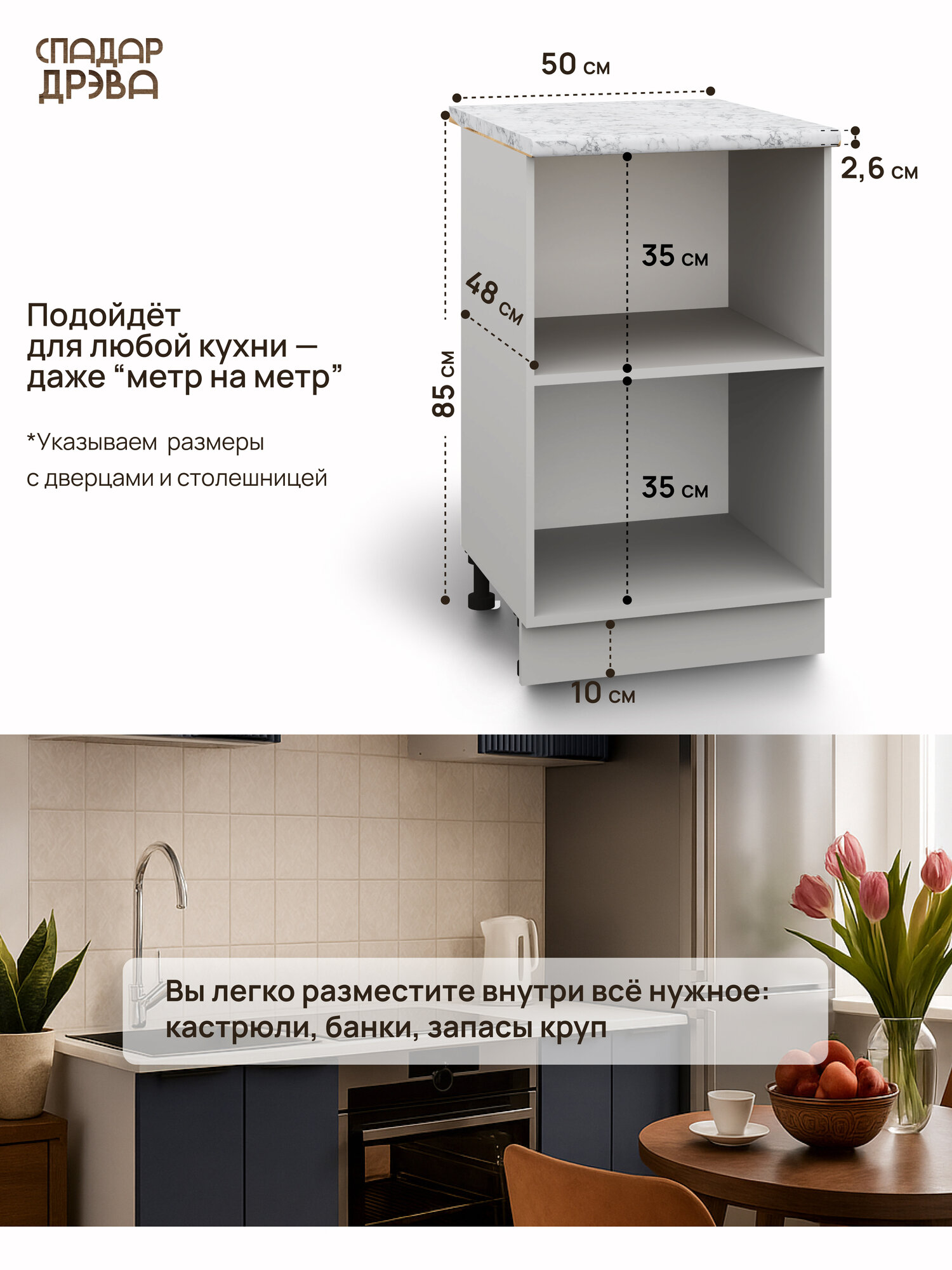 Модульная кухня становится удобной и гармоничной, если каждый элемент продуман для хранения и организации пространства. Напольный кухонный модуль 50 см с двумя дверцами от СпадарДрэва — это практичное решение для повседневного использования. Внутри предусмотрено отделение с полкой, где можно разместить кухонные принадлежности. Конструкция выполнена из прочных материалов, устойчива к нагрузкам и долговечна в эксплуатации. Дверцы закреплены на надёжных накладных петлях и оснащены металлическими ручками, что делает открывание удобным и простым. Такой кухонный модуль напольный легко комбинируется с другими элементами и помогает собрать функциональный кухонный гарнитур, создавая единую модульную кухню.