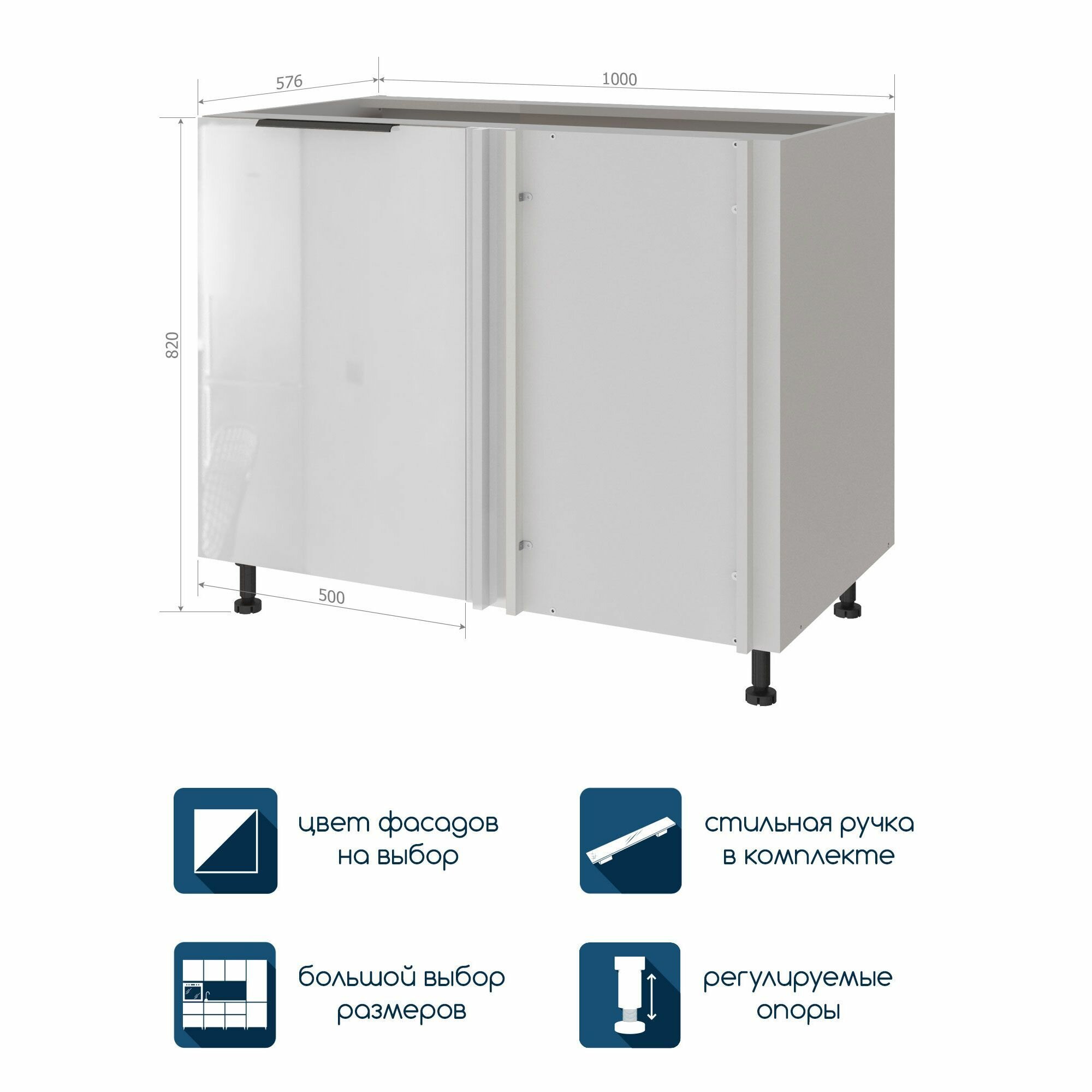 Кухонный модуль шкаф напольный угловой Beneli COLOR с доводчиком Белый глянец/Белый 110х576х82 см для кухни поможет создать идеальный кухонный гарнитур для вашей квартиры дома или дачи. Мы предлагаем приобрести кухонный модуль отдельно и дополнить его тем, что нужно именно вам: напольный или навесной шкаф для крепления на стену, тумба, торцевой шкаф или бутылочница, угловой шкаф или шкаф пенал, шкаф или пенал для встраиваемой техники. Все это вы сможете подобрать по вашим габаритам, размерам и цвету. Она идеальна для тех, кто хочет максимально использовать пространство на кухне и создать функциональный и удобный интерьер. Кухонный шкаф может использоваться как кухонный остров это позволит создать единый стиль интерьера и обеспечивает функциональность помещения. Кроме того, кухонные шкафы могут быть дополнены другими элементами, такими как столешница декоративная фурнитура или система хранения которая поможет максимально использовать пространство, предназначенное для кухонного гарнитура и передать общий стиль вашего дома Представляем вам модульную систему кухни "Колор" для вашего дома - прекрасное решение для создания вашего кухонного уголка. Кухня Колор - это модульная система мебели, комплект из отдельных блоков, которую можно легко собрать в единое, идеально подходящее вам пространство для хранения продуктов в вашем шкафу. В нашем ассортименте вы найдете огромный выбор напольных и подвесных корпусов с дверцами всех типов и размеров, которые позволяют максимально удобно хранить посуду и использовать пространство кухни.