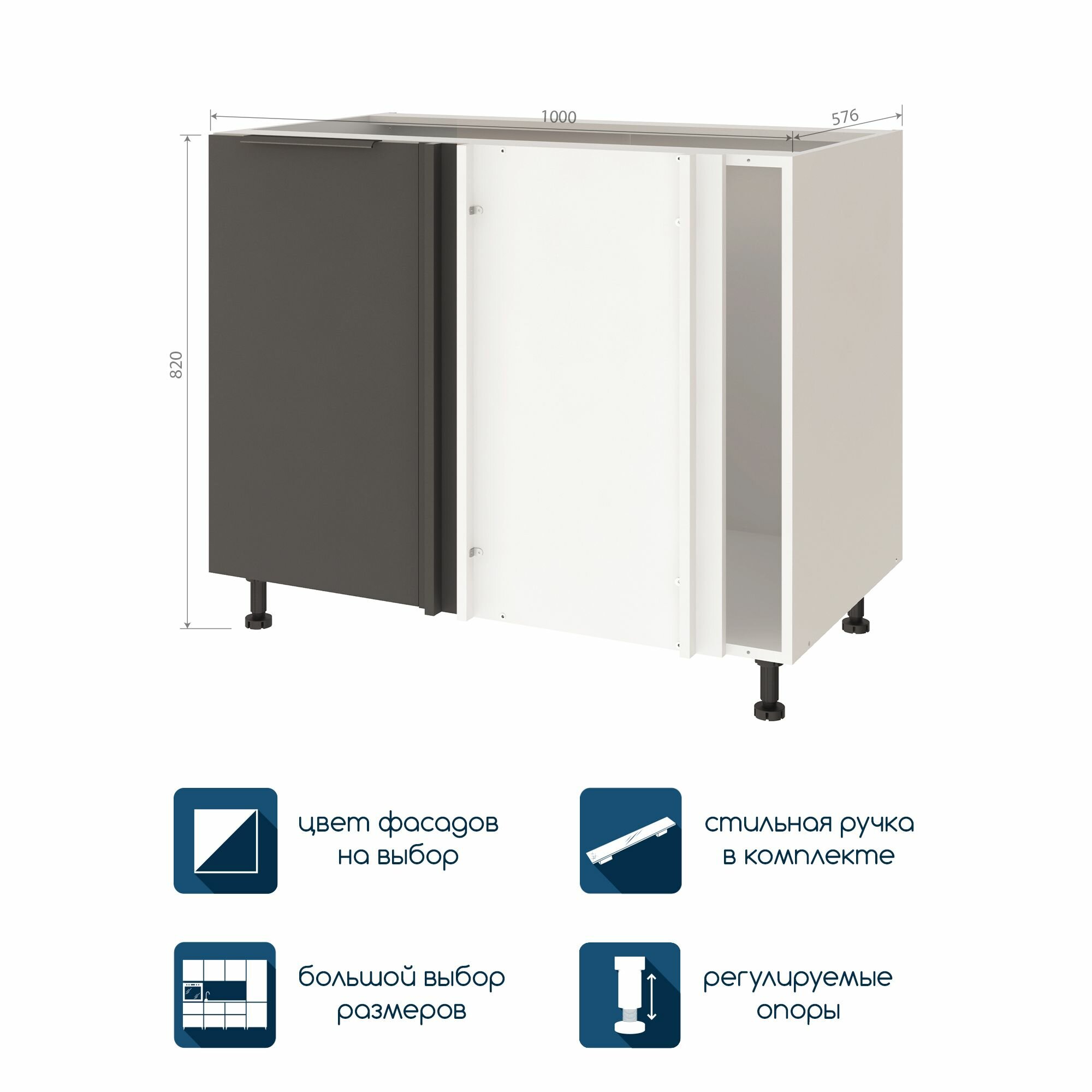 Кухонный модуль шкаф напольный угловой Beneli COLORс доводчиком Черный графит/Белый 100х576х82 см для кухни поможет создать идеальный кухонный гарнитур для вашей квартиры дома или дачи. Мы предлагаем приобрести кухонный модуль отдельно и дополнить его тем, что нужно именно вам: напольный или навесной шкаф для крепления на стену, тумба, торцевой шкаф или бутылочница, угловой шкаф или шкаф пенал, шкаф или пенал для встраиваемой техники. Все это вы сможете подобрать по вашим габаритам, размерам и цвету. Она идеальна для тех, кто хочет максимально использовать пространство на кухне и создать функциональный и удобный интерьер. Кухонный шкаф может использоваться как кухонный остров это позволит создать единый стиль интерьера и обеспечивает функциональность помещения. Кроме того, кухонные шкафы могут быть дополнены другими элементами, такими как столешница декоративная фурнитура или система хранения которая поможет максимально использовать пространство, предназначенное для кухонного гарнитура и передать общий стиль вашего дома Представляем вам модульную систему кухни "Колор" для вашего дома - прекрасное решение для создания вашего кухонного уголка. Кухня Колор - это модульная система мебели, комплект из отдельных блоков, которую можно легко собрать в единое, идеально подходящее вам пространство для хранения продуктов в вашем шкафу. В нашем ассортименте вы найдете огромный выбор напольных и подвесных корпусов с дверцами всех типов и размеров, которые позволяют максимально удобно хранить посуду и использовать пространство кухни.