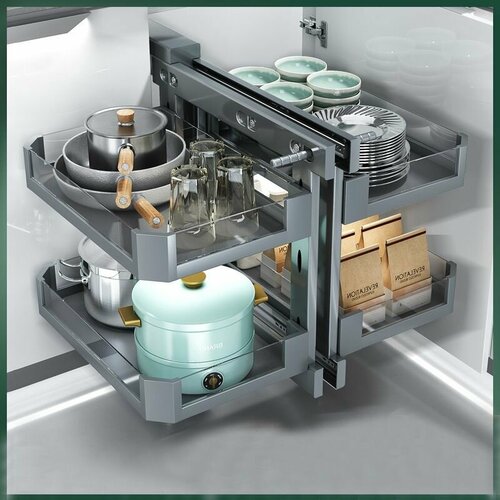 Благодаря гидравлическому демпфирующему устройству,«Волшебный уголок» Выдвижная корзина обеспечивает стабильное бесшумное движение и плавное закрывание без рывков даже при максимальной загрузке 100 кг. поэтому в корзинах можно хранить тяжелые кастрюли, казан или утятницу.