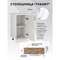 Кухонная тумба 40 см с полкой из кухонного гарнитура “Аврора” — это идеальное решение для тех, кто хочет функциональности и компактности на своей кухне. Этот кухонный напольный шкаф из модульного гарнитура представляет собой идеальное сочетание стиля и практичности. Кухонный модуль выполнен в современном стиле минимализм и представлен в элегантном белом цвете. Используемый материал - ЛДСП класса Е1 - гарантирует безопасность и экологичность мебели. Тумба оснащена регулируемыми опорами (+3 см) для удобной установки и регулировки высоты. В комплекте идёт стильная и функциональная столешница “Скиф”, выполненная в цвете Гранит. Она станет отличным дополнением к кухонному гарнитуру и добавит изюминку в интерьер вашей кухни. Полный набор качественной и надежной фурнитуры, входящий в комплект, обеспечит удобство и комфорт при использовании кухонного шкафа. Модульная кухня “Аврора” предлагает широкий выбор кухонных модулей различных размеров и конфигураций, что позволяет создать уникальный и функциональный интерьер вашей кухни.