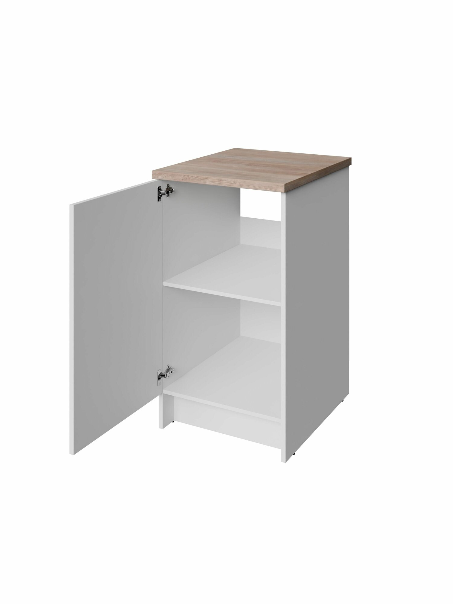 Напольные кухонные шкафы глубиной и высотой больше стандартных, поэтому их вместимость и рабочая поверхность больше на 20%. Модуль плотно встает к стене, комфортная высота позволяет готовить, не наклоняясь. Дверца шкафчика – перенавешиваемая, ее можно установить справа или слева. Внутри кухонного стола предусмотрена 1 полка, которую можно установить на удобной высоте.