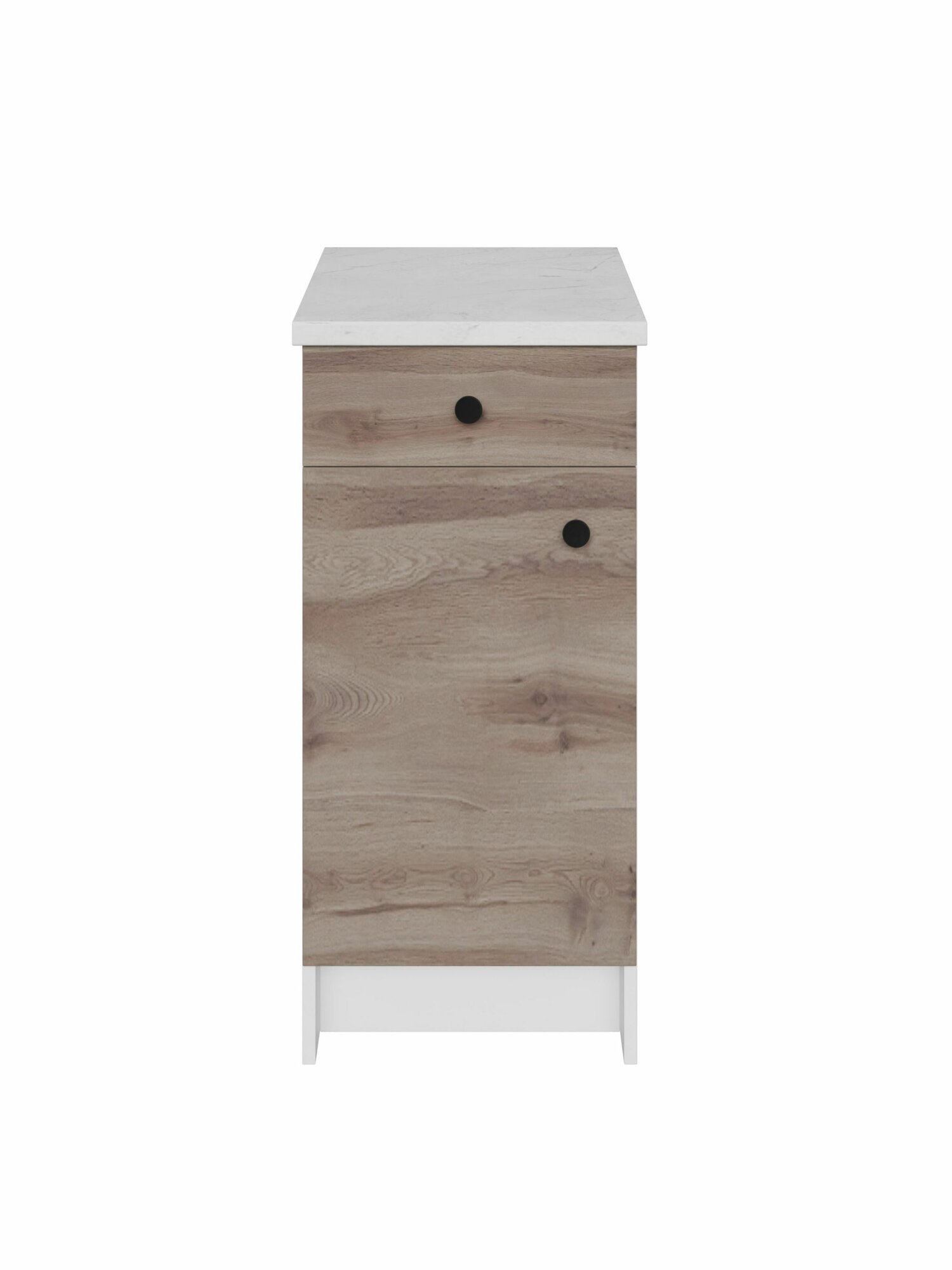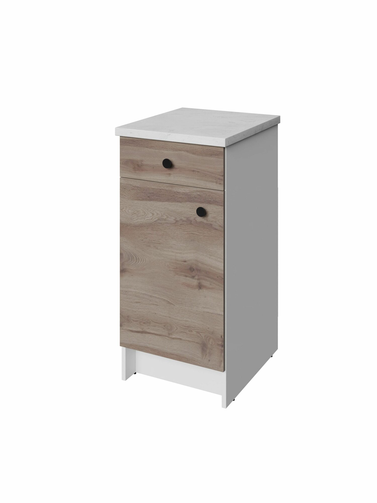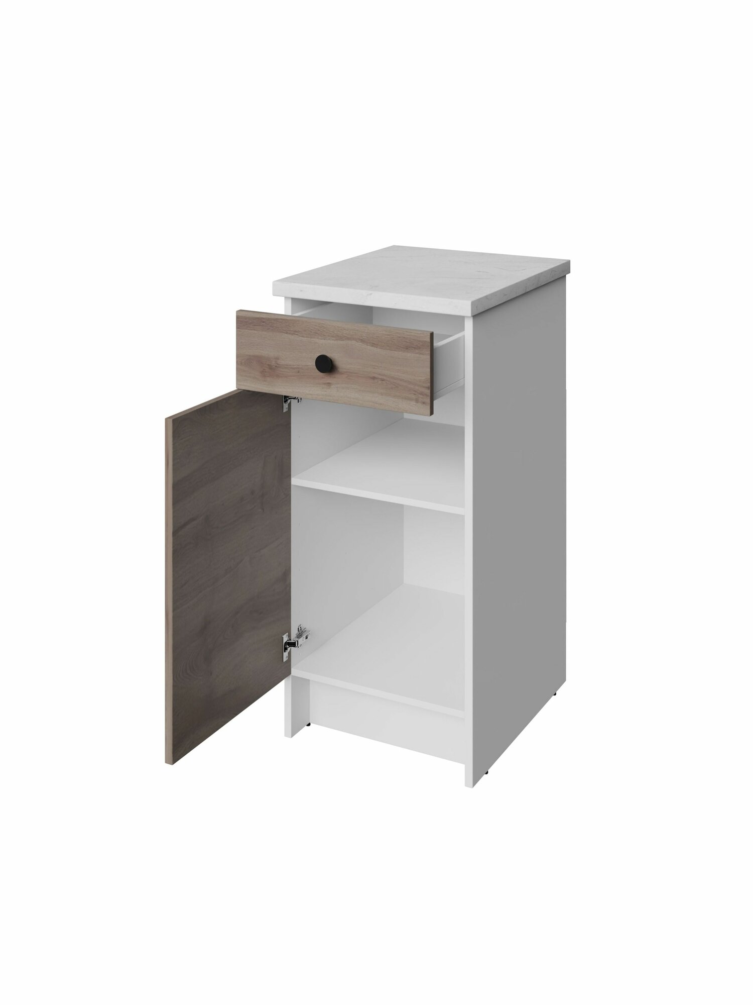 Напольные шкафы Солна глубже и выше стандартных, поэтому их вместимость и рабочая поверхность больше на 20%. Модуль плотно встает к стене, комфортная высота позволяет готовить, не наклоняясь. Дверца шкафчика – перенавешиваемая, ее можно установить справа или слева. Внутри кухонного стола предусмотрена 1 полка, которую можно установить на удобной высоте. Выдвижной ящик для столовых приборов фиксируется на скрытых шариковых направляющих частичного выдвижения Hettich (Германия): они обеспечивают плавный ход, легкое и бесшумное скольжение. Несущая нагрузка на ящик - 25 кг.