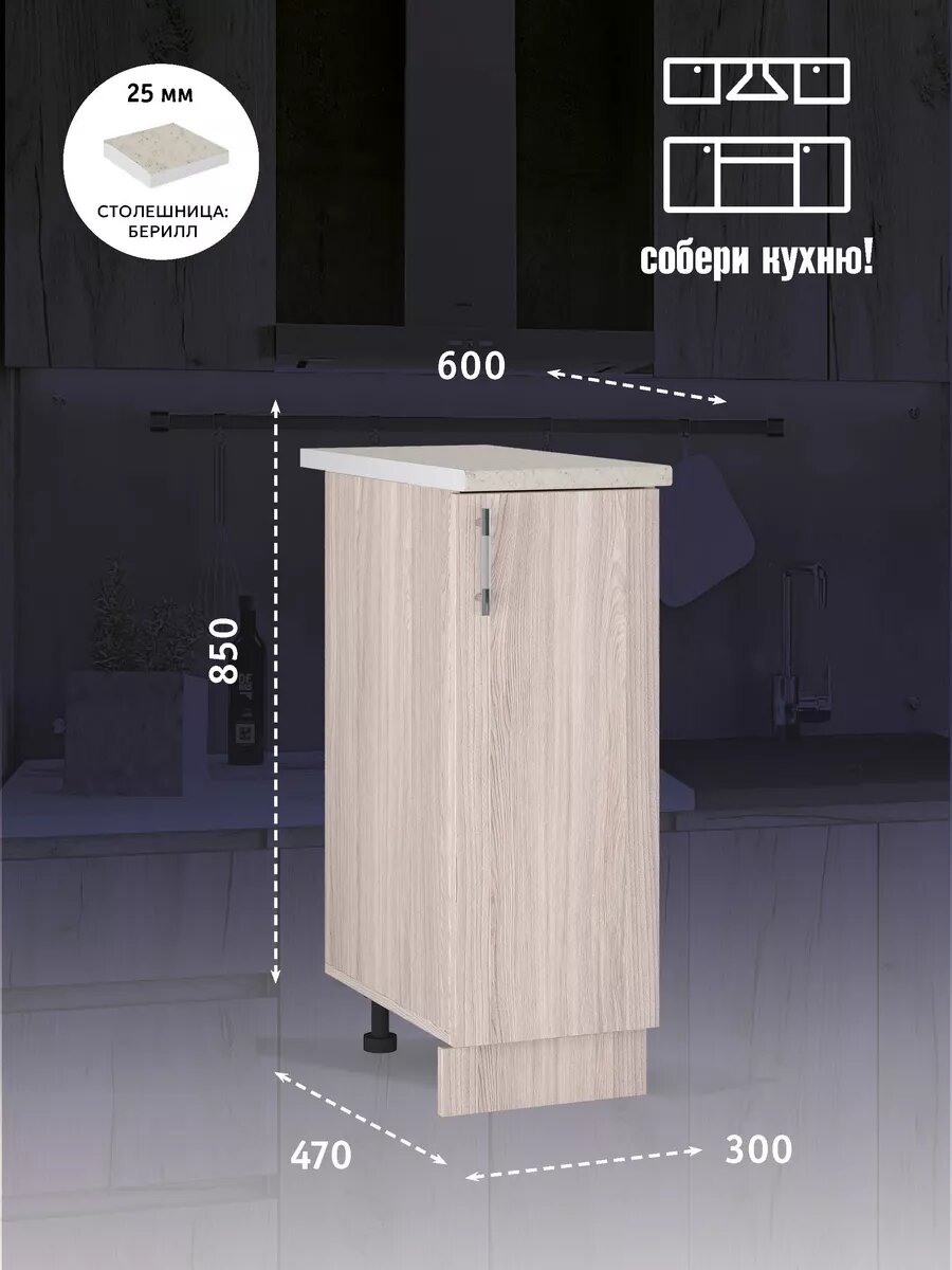 Представляем вашему вниманию узкий напольный шкаф из модульной кухонной коллекции "Аврора" от мебельной фабрики Ваша Мебель. Этот стильный и компактный элемент мебели станет идеальным решением для небольших кухонь или для создания эргономичного пространства. Ширина тумбы составляет 30 см, что позволяет эффективно использовать каждый сантиметр доступного пространства. Внутри шкафа расположена полка, на которую вы сможете разместить кухонную утварь, столовые приборы или другие принадлежности. Высококачественная ЛДСП класса Е1 обеспечивает прочность и надежность мебели, а цвет «Ясень Шимо Светлый» делает шкаф универсальным и подходящим к любому интерьеру. Современный минималистичный дизайн позволяет кухонному модулю легко сочетаться с другими элементами мебели и декора. Регулируемые опоры обеспечивают устойчивость шкафа даже на неровных поверхностях, а входящая в комплект столешница цвета «Берилл» придает завершенность и стиль всему комплекту. "Аврора" - это модульная коллекция, которая позволяет комбинировать различные элементы для создания уникального и функционального кухонного гарнитура. Выберите нужные элементы и создайте кухню своей мечты!