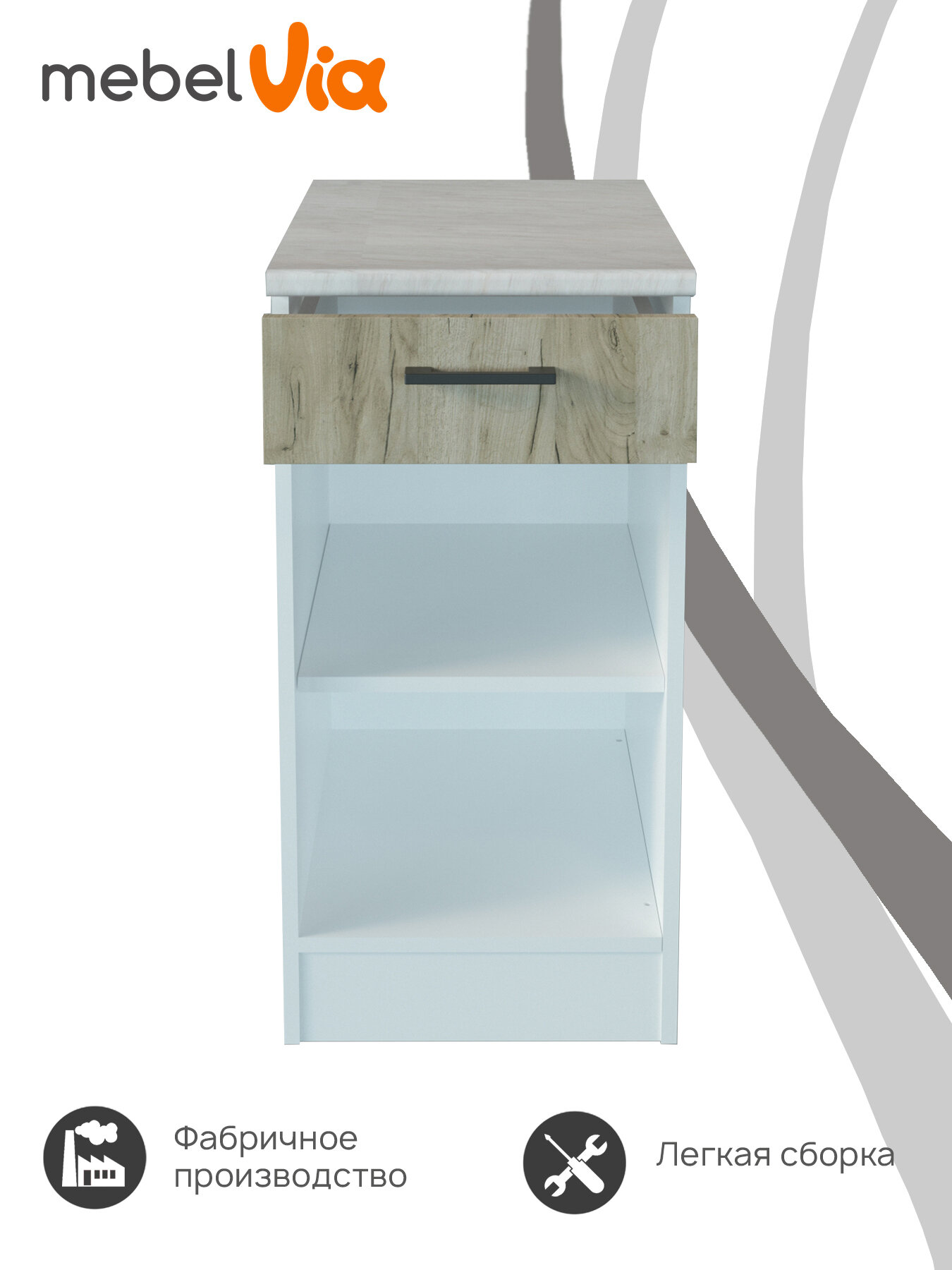 Тумба оснащена ящиком для хранения различных кухонных принадлежностей и аксессуаров. Это позволяет сэкономить пространство на кухне и поддерживать порядок.