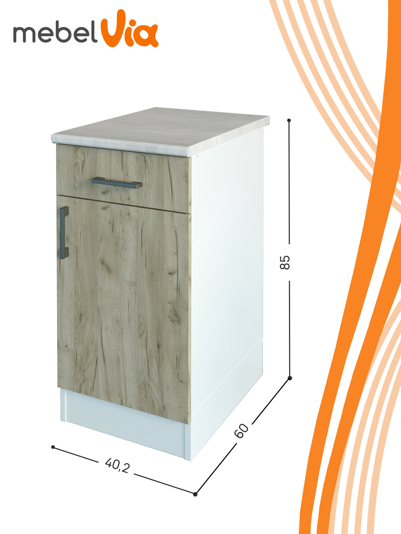 Размеры тумбы составляют 40,2х60х85 см, что делает ее компактной и удобной для использования на небольших кухнях.