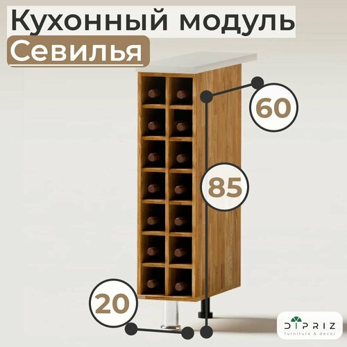 Конструкция винного шкафа для бутылок из массива дуба оснащена 14 нишами, которые подойдут для аккуратной организации пространства кухни и размещения различных предметов: от бутылок с любимыми напитками до специй и декора. Размеры шкафа под кухню в собранном виде (Ширина х Глубина х Высота, см) - 20х60х85 см, что позволит использовать его как в качестве небольшой кухонной тумбы для бутылок, так и для создания полноценного кухонного гарнитура серии Севилья. Вариант модуля кухни поставляется со столешницей размерами 20х60 см, толщина - 22 мм. Столешница выполнена с гладкими краями и кромками, что предотвращает случайные травмы и удары при использовании.