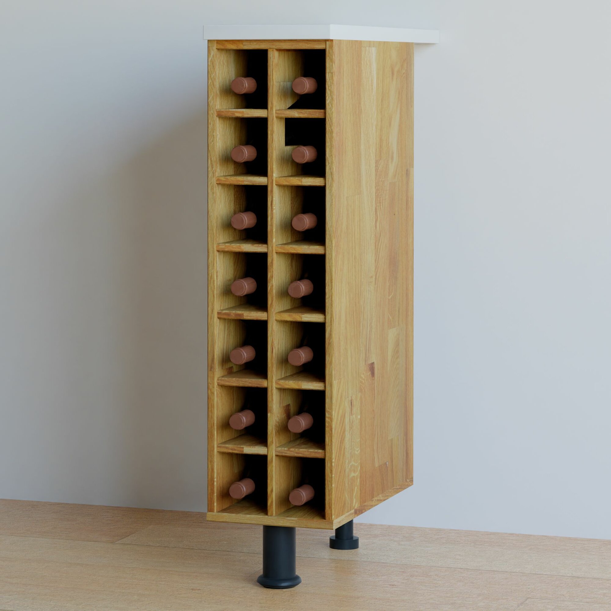 Конструкция винного шкафа для бутылок из массива дуба оснащена 14 нишами, которые подойдут для аккуратной организации пространства кухни и размещения различных предметов: от бутылок с любимыми напитками до специй и декора. Размеры шкафа под кухню в собранном виде (Ширина х Глубина х Высота, см) - 20х60х85 см, что позволит использовать его как в качестве небольшой кухонной тумбы для бутылок, так и для создания полноценного кухонного гарнитура серии Валенсия. Вариант модуля кухни поставляется со столешницей размерами 20х60 см, толщина - 22 мм. Столешница выполнена с гладкими краями и кромками, что предотвращает случайные травмы и удары при использовании.