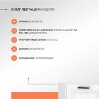 Регулируемые опоры в комплекте с достаточным диапазоном регулировки помогут при установке модуля на не подготовленное и не ровное основание. Цоколь закрывающий ножки поставляется в комплекте и производится в цвете корпуса напольного шкафа.