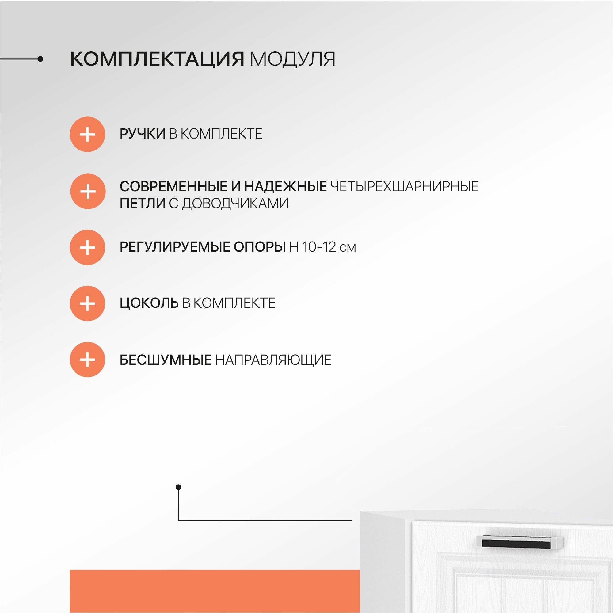 Данный напольный кухонный модуль может использоваться самостоятельно, либо в комбинации с другими навесными кухонными шкафами и напольными тумбами, создавая полноценный кухонный гарнитур. При этом не требуется создание сложного проекта, достаточно выбрать необходимые вам модули для кухни или воспользоваться одним из готовых решений, представленных в нашем магазине.