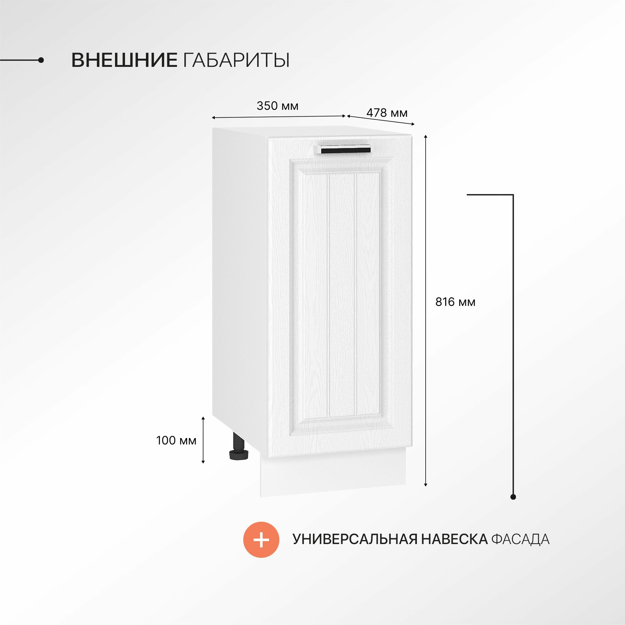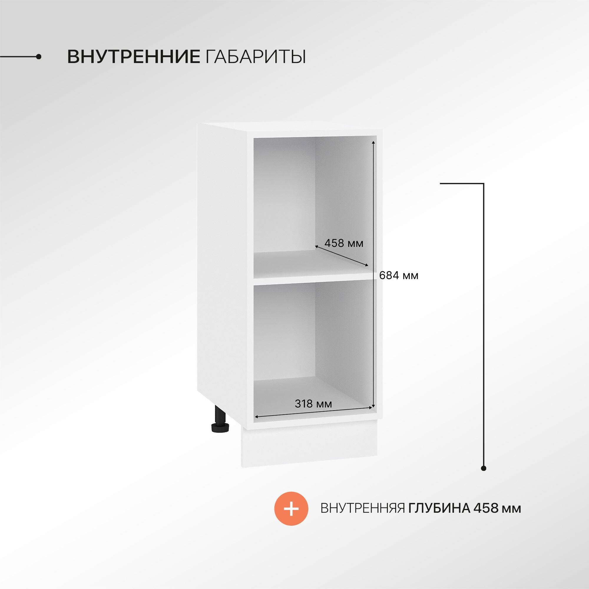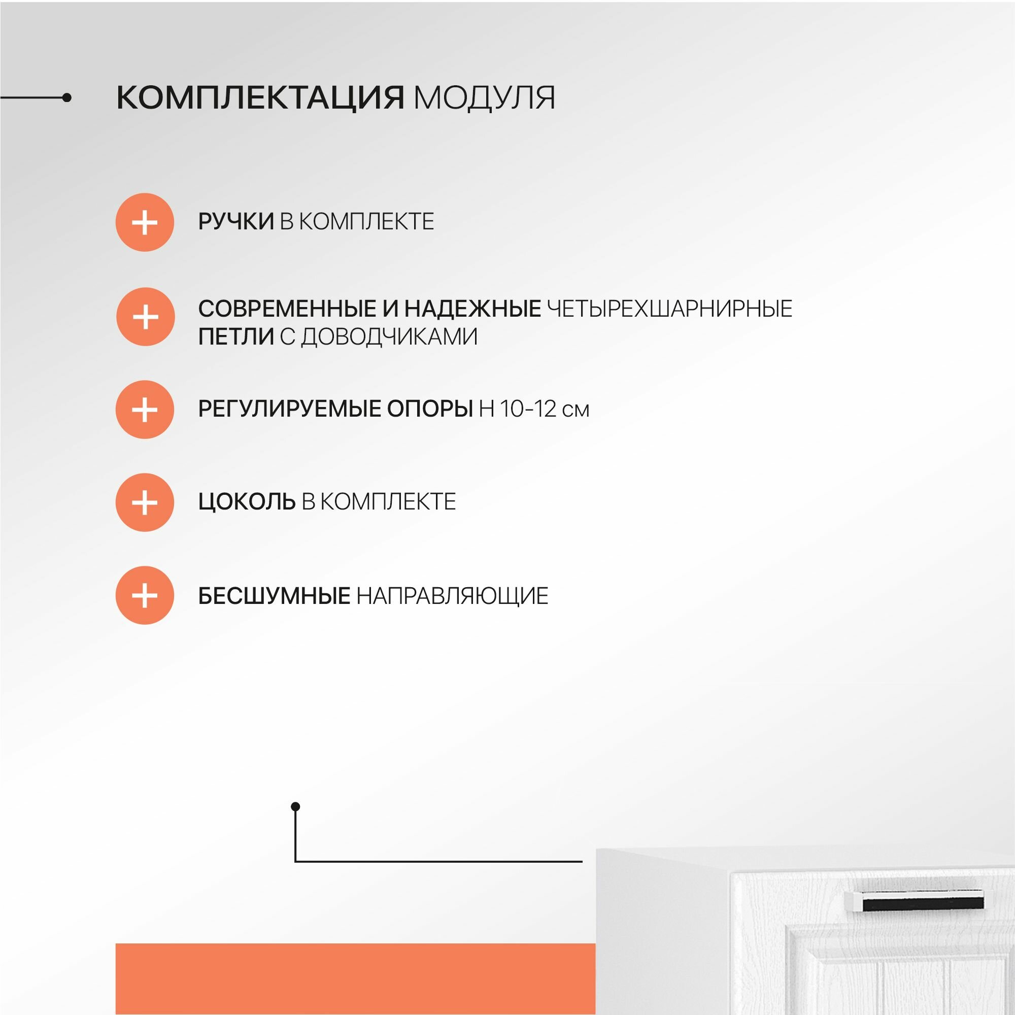 Регулируемые опоры в комплекте с достаточным диапазоном регулировки помогут при установке модуля на не подготовленное и не ровное основание. Цоколь закрывающий ножки поставляется в комплекте и производится в цвете корпуса напольного шкафа.