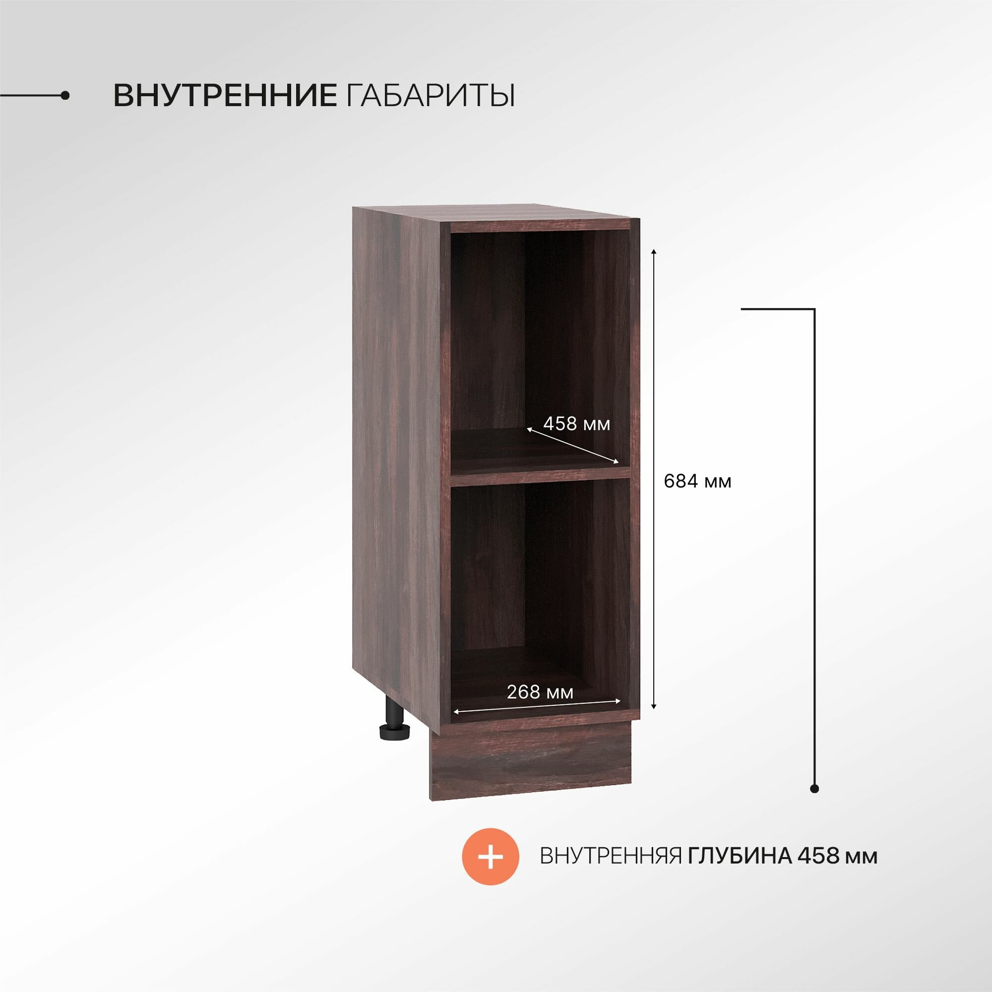 Регулируемые опоры в комплекте с достаточным диапазоном регулировки помогут при установке модуля на не подготовленное и не ровное основание. Цоколь закрывающий ножки поставляется в комплекте и производится в цвете корпуса напольного шкафа.