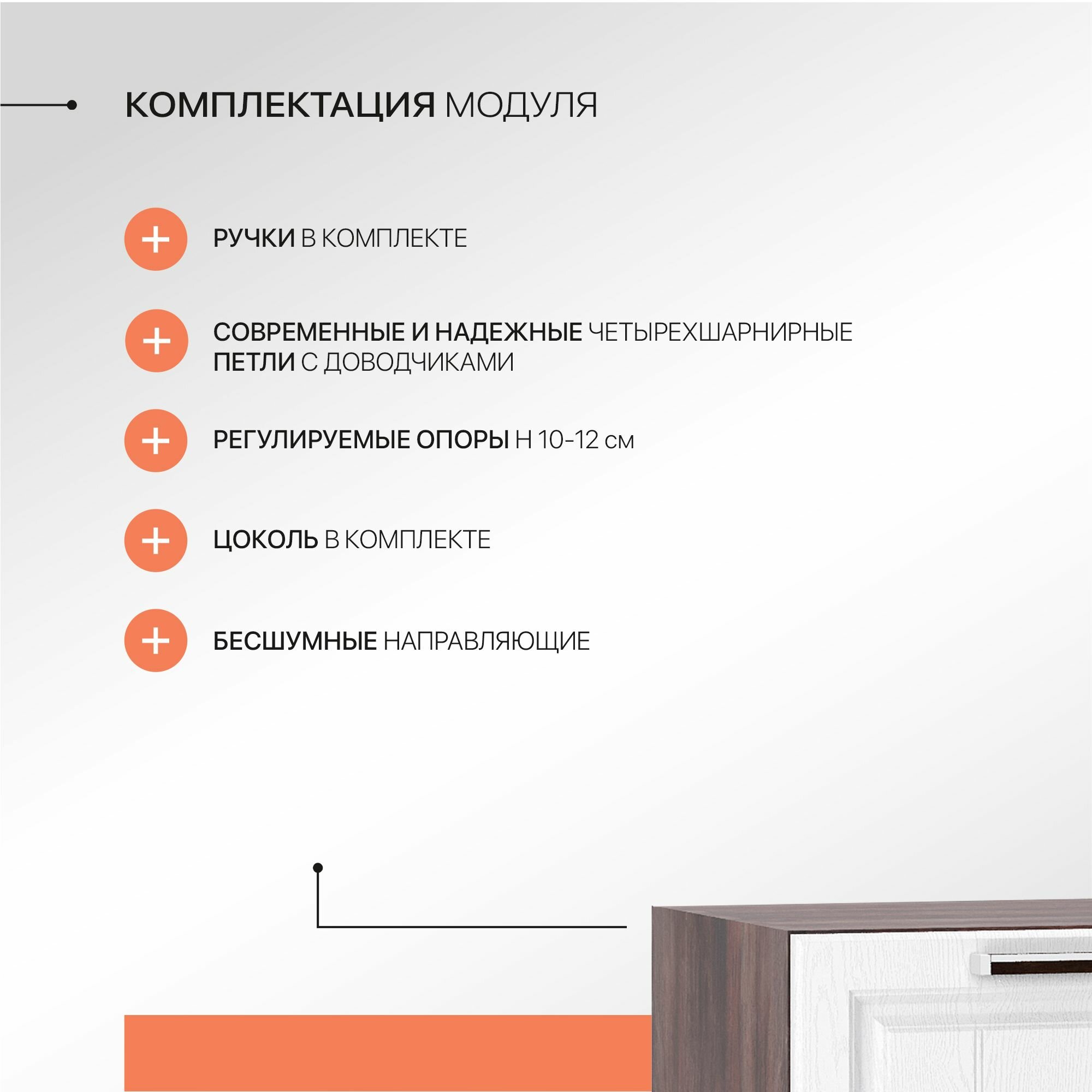 Данный напольный кухонный модуль может использоваться самостоятельно, либо в комбинации с другими навесными кухонными шкафами и напольными тумбами, создавая полноценный кухонный гарнитур. При этом не требуется создание сложного проекта, достаточно выбрать необходимые вам модули для кухни или воспользоваться одним из готовых решений, представленных в нашем магазине.