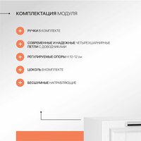 Регулируемые опоры в комплекте с достаточным диапазоном регулировки помогут при установке модуля на не подготовленное и не ровное основание. Цоколь закрывающий ножки поставляется в комплекте и производится в цвете корпуса напольного шкафа.