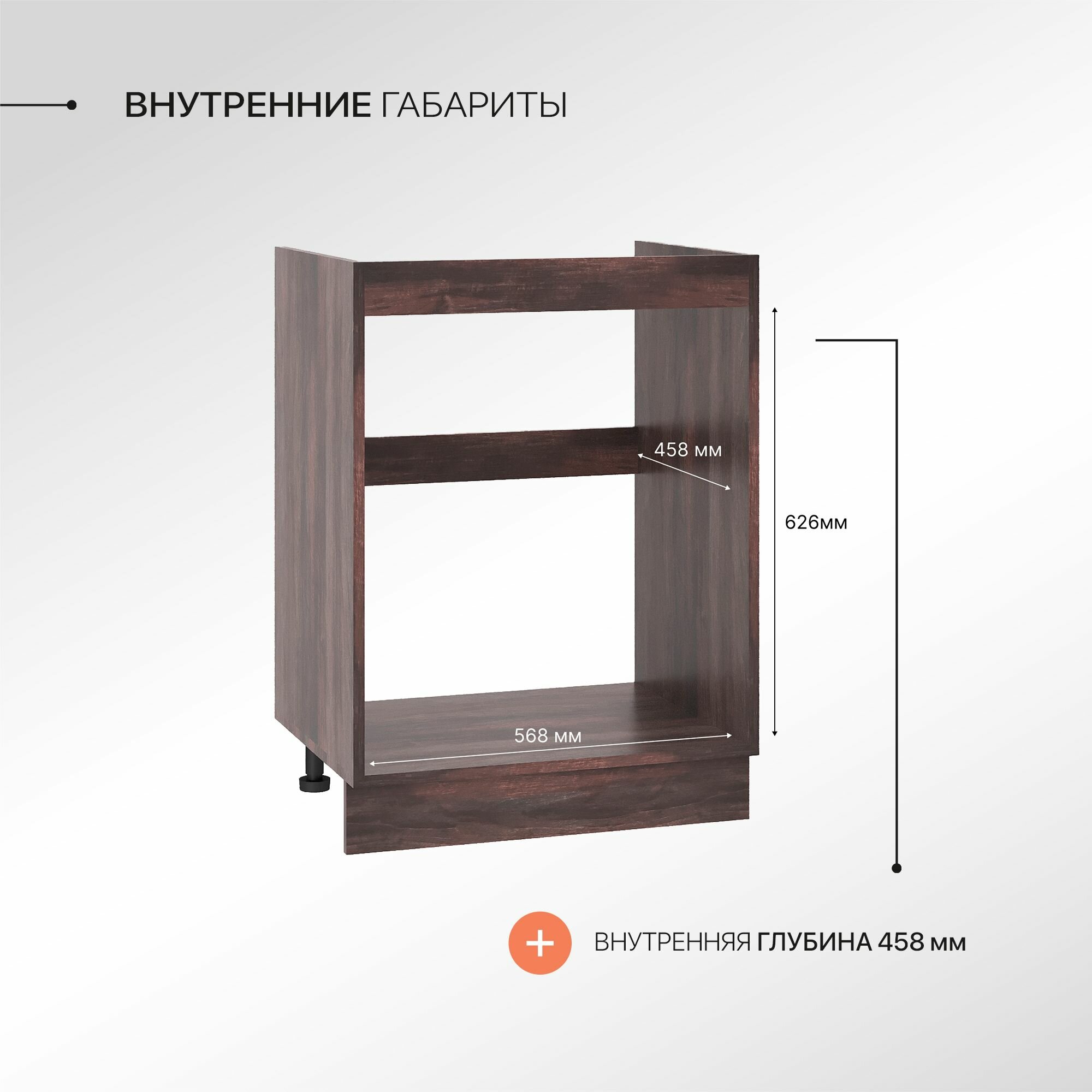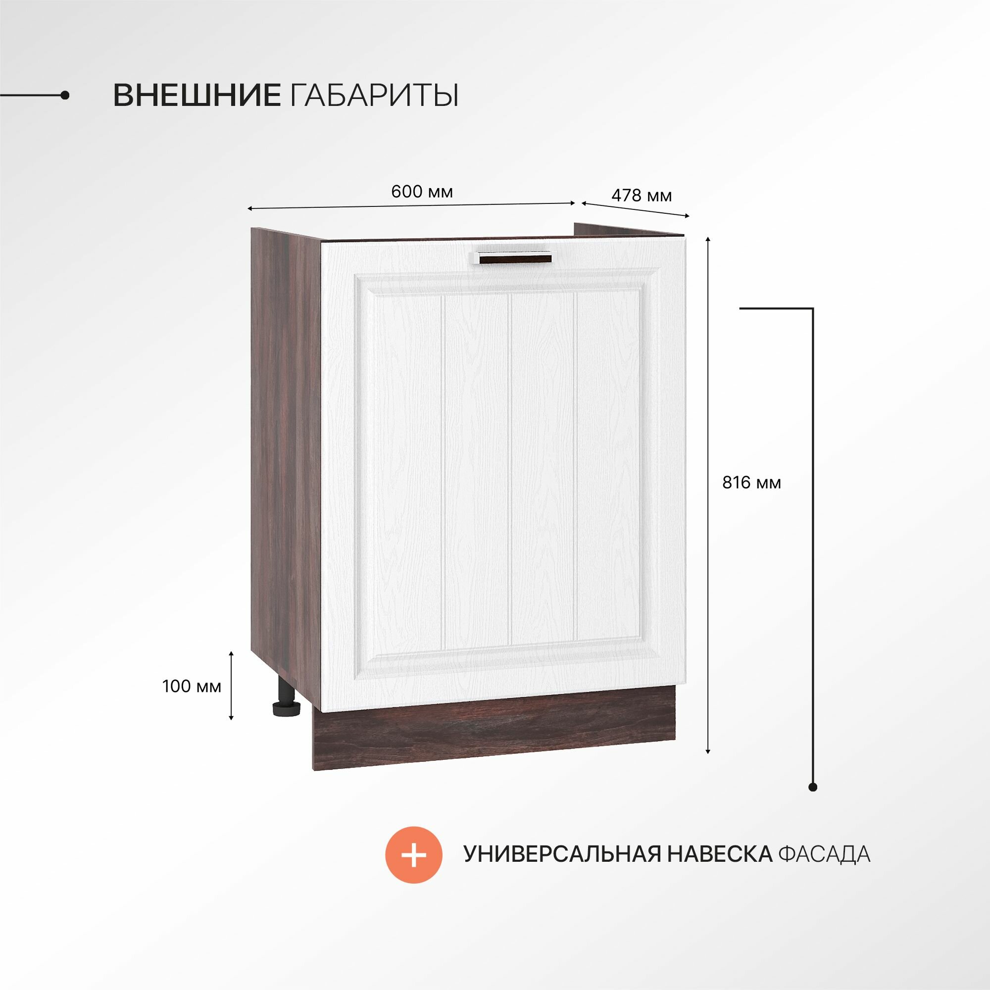 Регулируемые опоры в комплекте с достаточным диапазоном регулировки помогут при установке модуля на не подготовленное и не ровное основание. Цоколь закрывающий ножки поставляется в комплекте и производится в цвете корпуса напольного шкафа.